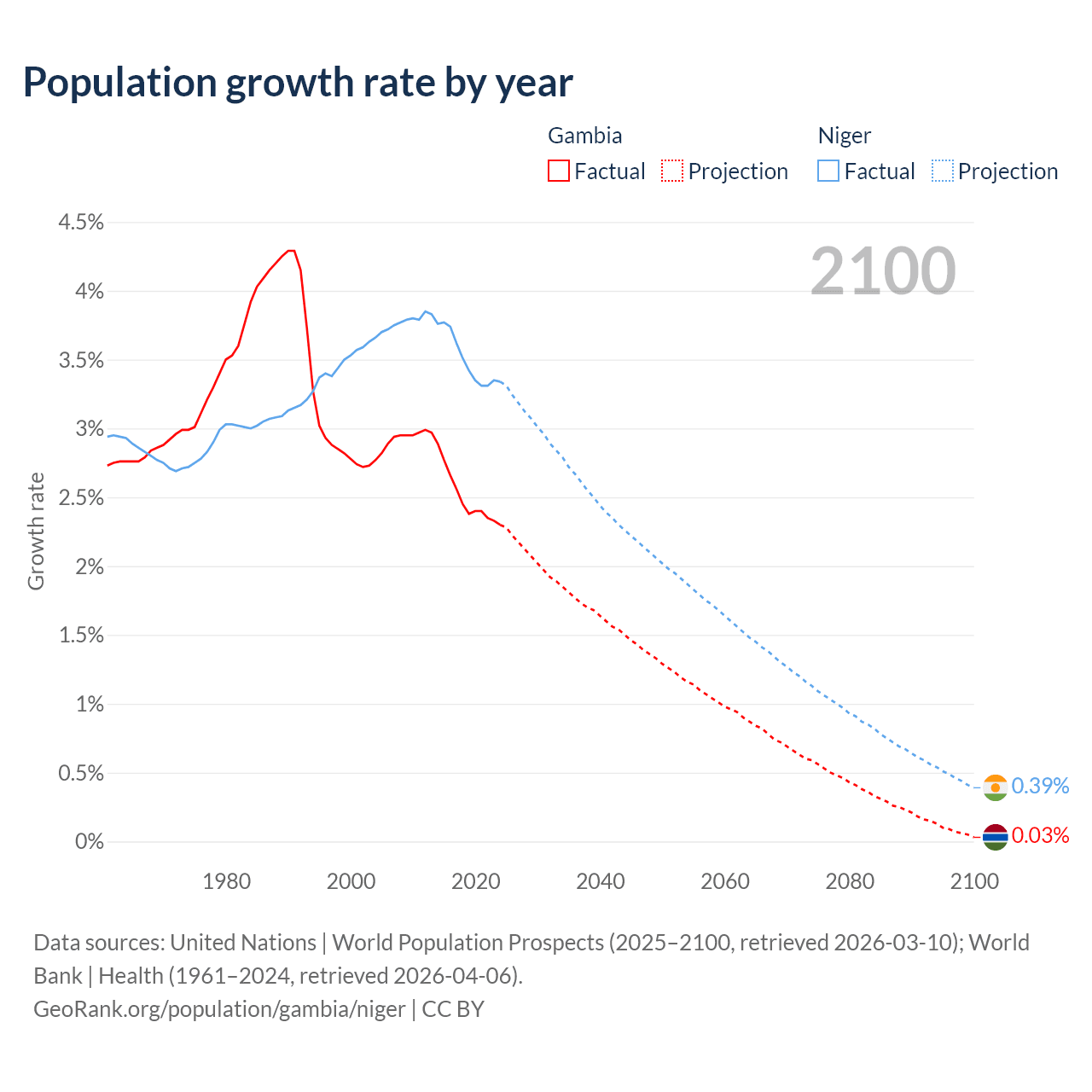 - For the last 10 years, the Gambia has had an average growth rate of +2.5% per year vs +3.5% in Niger.