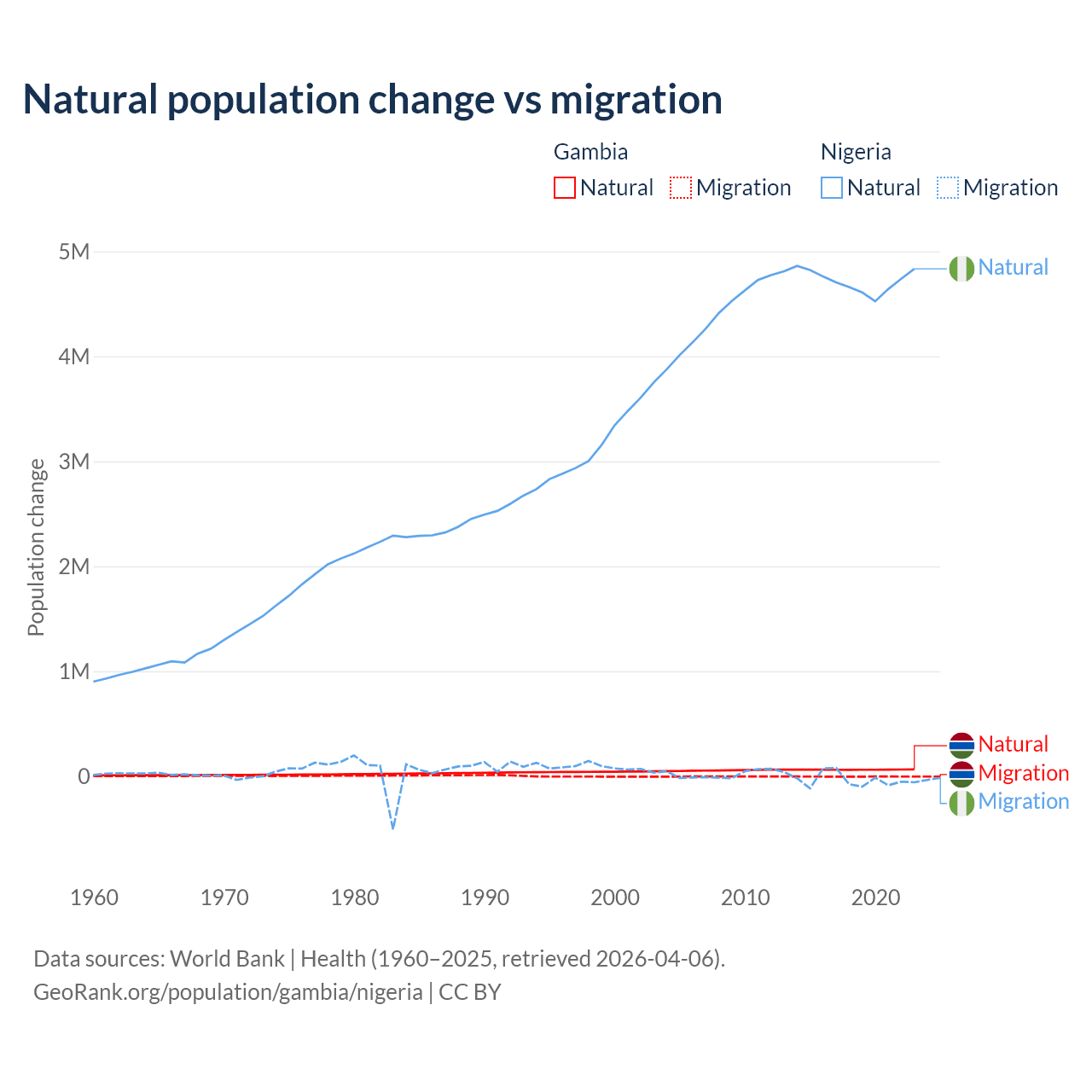 Over the last 10 years, 95.2% of the population change in the Gambia is from natural causes (a gain of 625,795 people) and 4.75% is from migration (a loss of 31,227 people). In Nigeria 99.2% is from natural causes (a gain of 47,163,517 people) and 0.77% is from migration (a loss of 368,103 people).