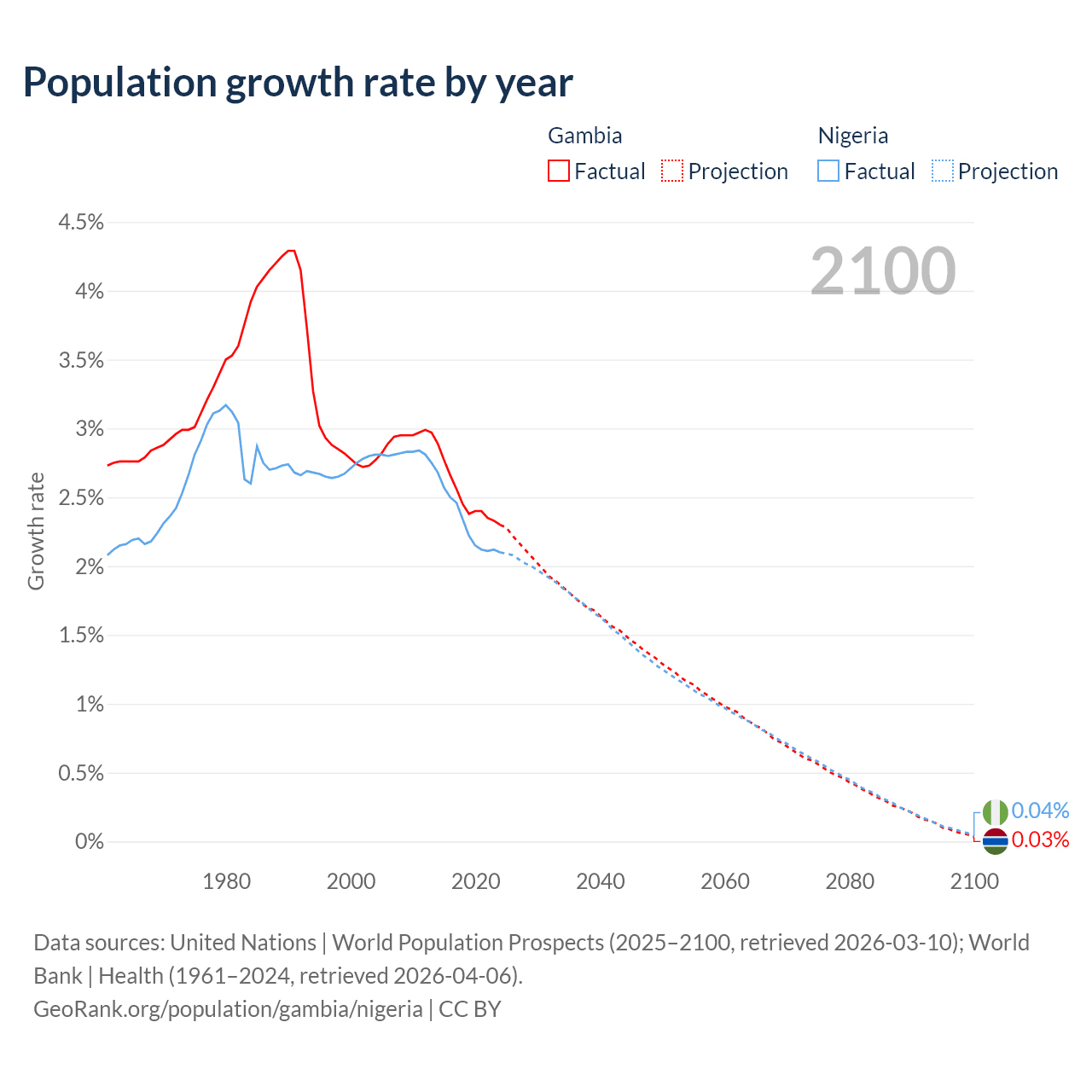 - For the last 10 years, the Gambia has had an average growth rate of +2.5% per year vs +2.31% in Nigeria.