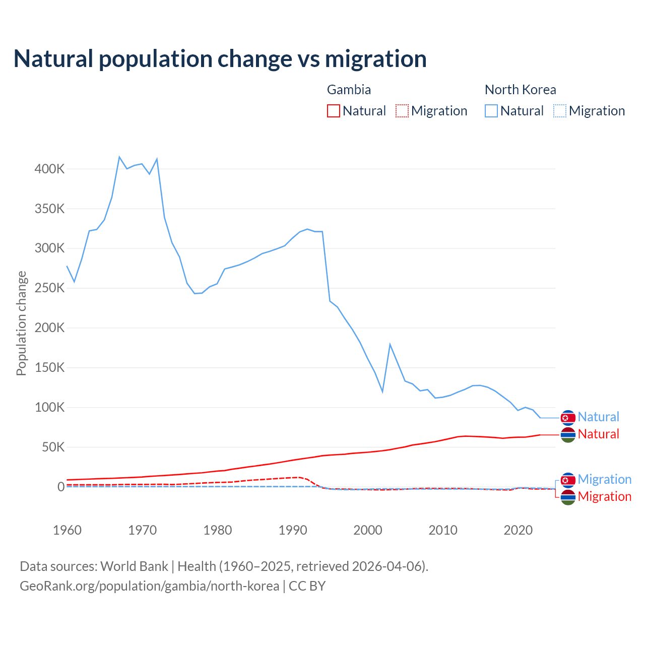 Over the last 10 years, 95.2% of the population change in the Gambia is from natural causes (a gain of 625,795 people) and 4.75% is from migration (a loss of 31,227 people). In North Korea 97.7% is from natural causes (a gain of 1,097,372 people) and 2.33% is from migration (a loss of 26,227 people).