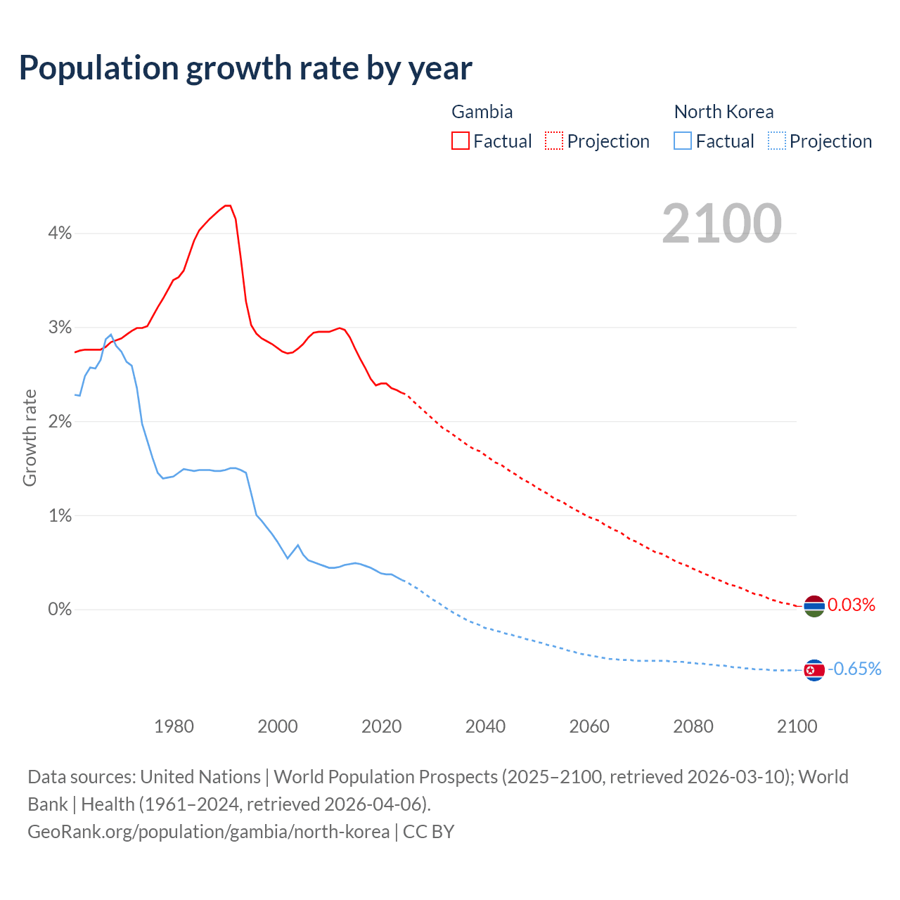 - For the last 10 years, the Gambia has had an average growth rate of +2.5% per year vs +0.41% in North Korea.