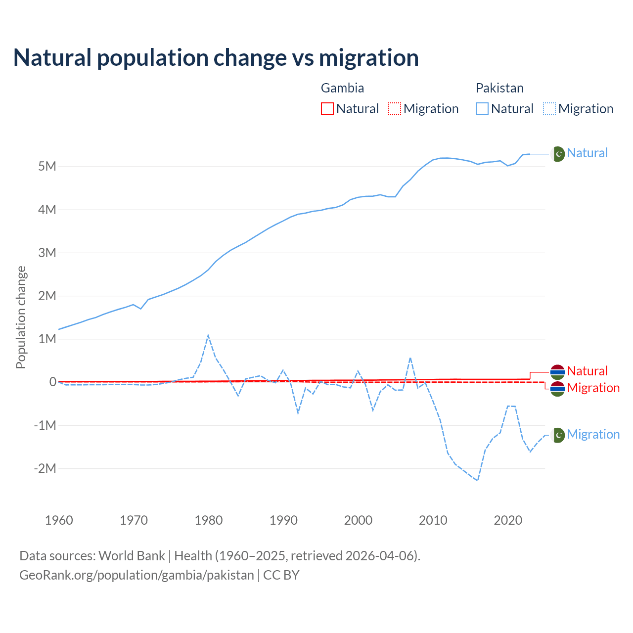 Over the last 10 years, 95.2% of the population change in the Gambia is from natural causes (a gain of 625,795 people) and 4.75% is from migration (a loss of 31,227 people). In Pakistan 77.8% is from natural causes (a gain of 51,255,404 people) and 22.2% is from migration (a loss of 14,629,055 people).