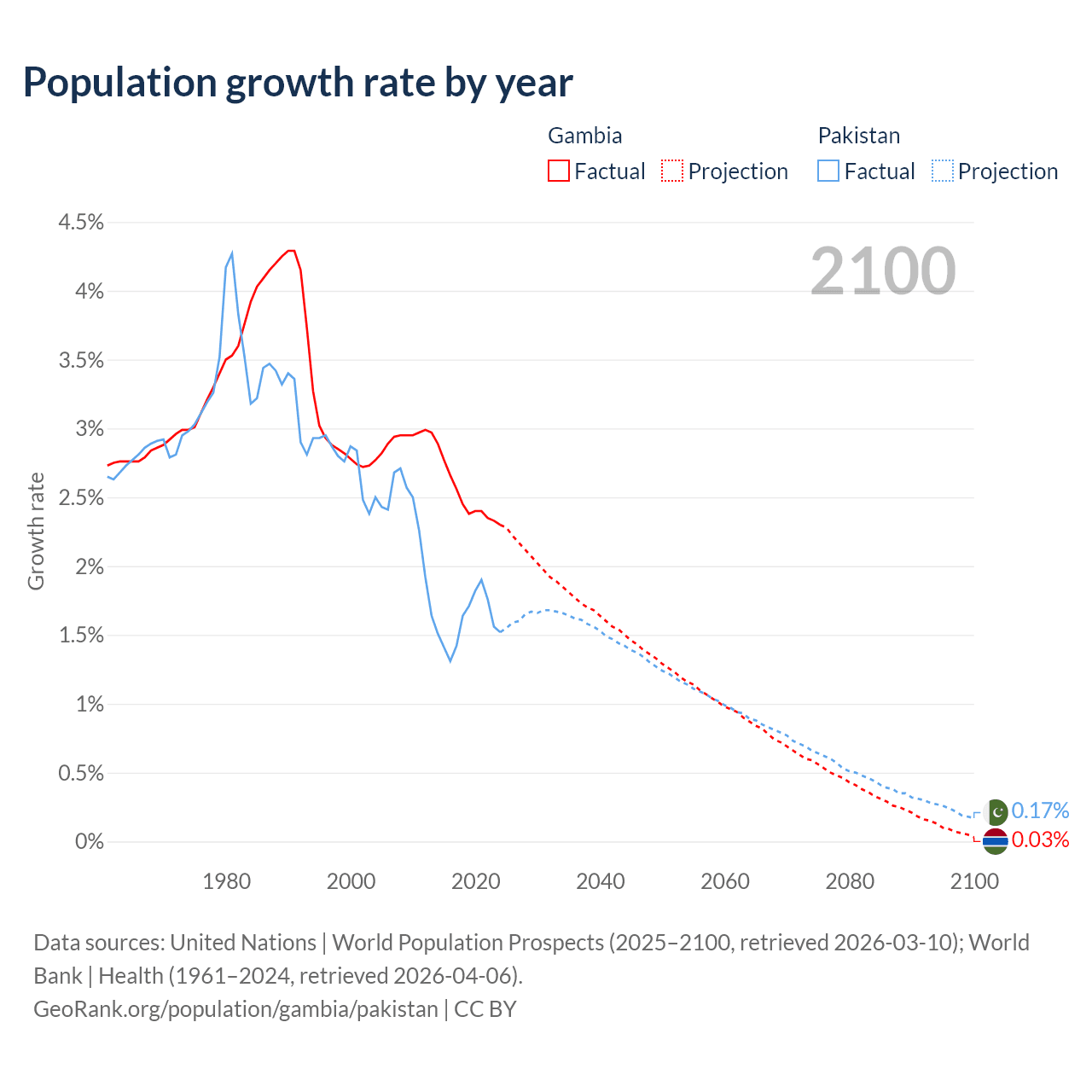 - For the last 10 years, the Gambia has had an average growth rate of +2.5% per year vs +1.6% in Pakistan.