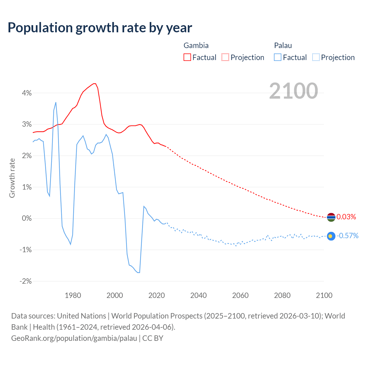 - For the last 10 years, the Gambia has had an average growth rate of +2.5% per year vs +0.02% in Palau.