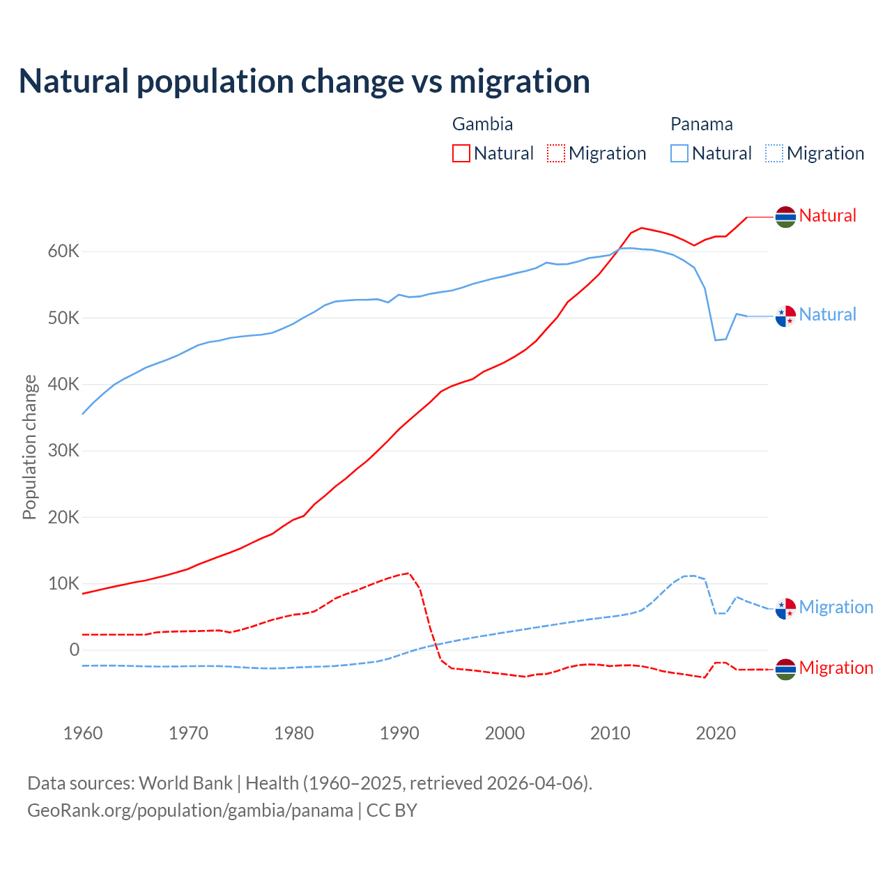Over the last 10 years, 95.2% of the population change in the Gambia is from natural causes (a gain of 625,795 people) and 4.75% is from migration (a loss of 31,227 people). In Panama 86.5% is from natural causes (a gain of 544,211 people) and 13.5% is from migration (a gain of 84,849 people).