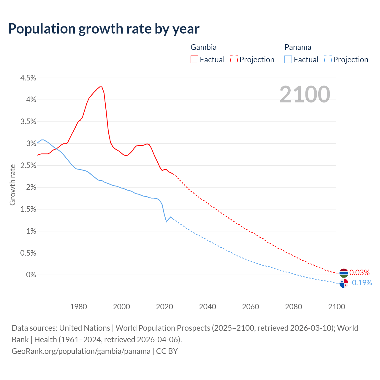 - For the last 10 years, the Gambia has had an average growth rate of +2.5% per year vs +1.52% in Panama.