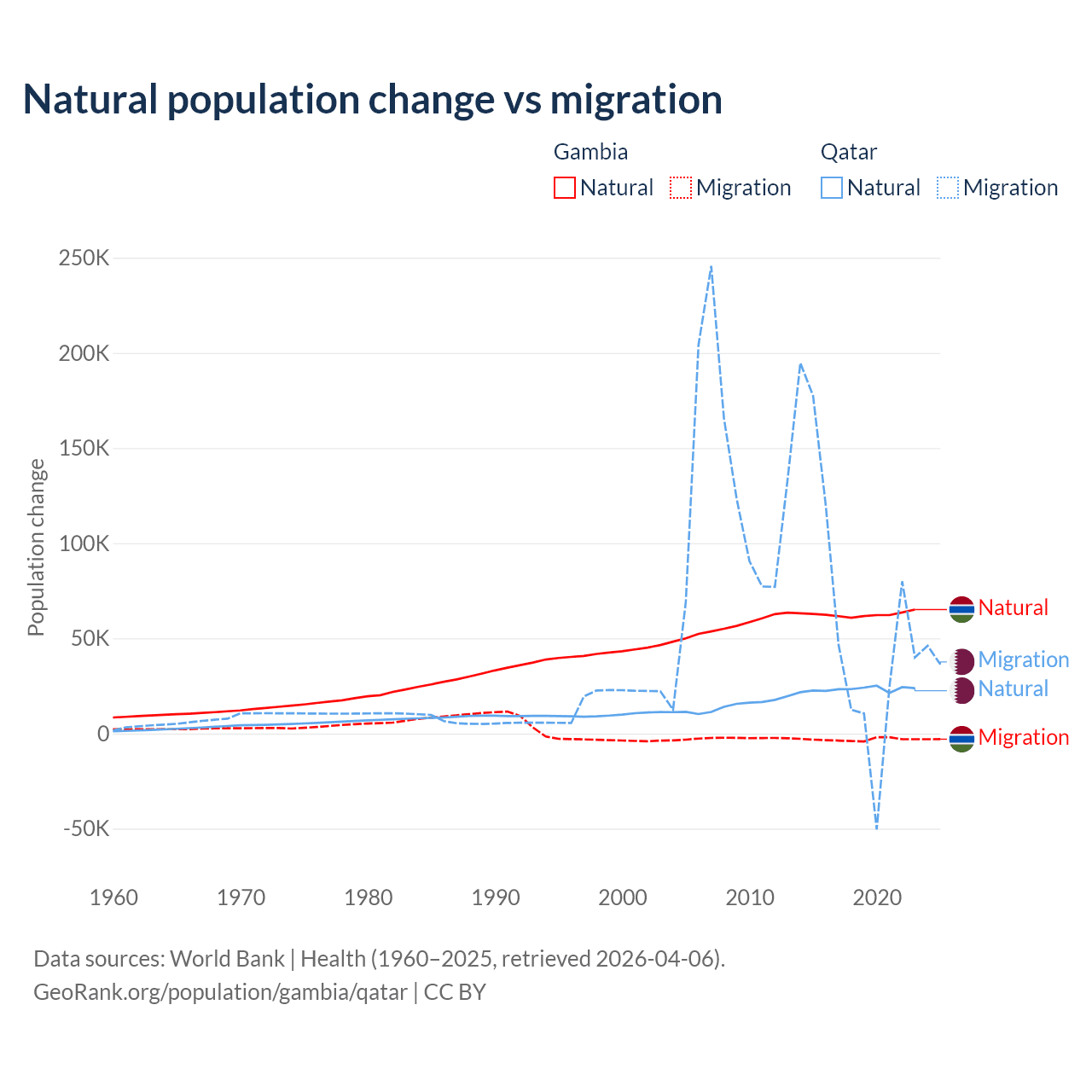 Over the last 10 years, 95.2% of the population change in the Gambia is from natural causes (a gain of 625,795 people) and 4.75% is from migration (a loss of 31,227 people). In Qatar 26.1% is from natural causes (a gain of 232,009 people) and 73.9% is from migration (a gain of 655,712 people).