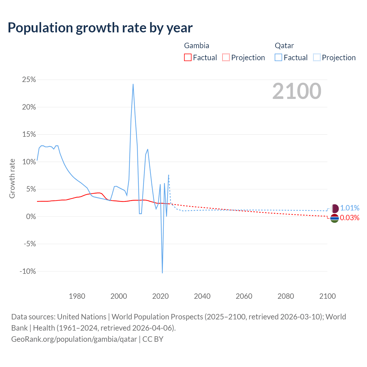 - For the last 10 years, the Gambia has had an average growth rate of +2.5% per year vs +3.86% in Qatar.