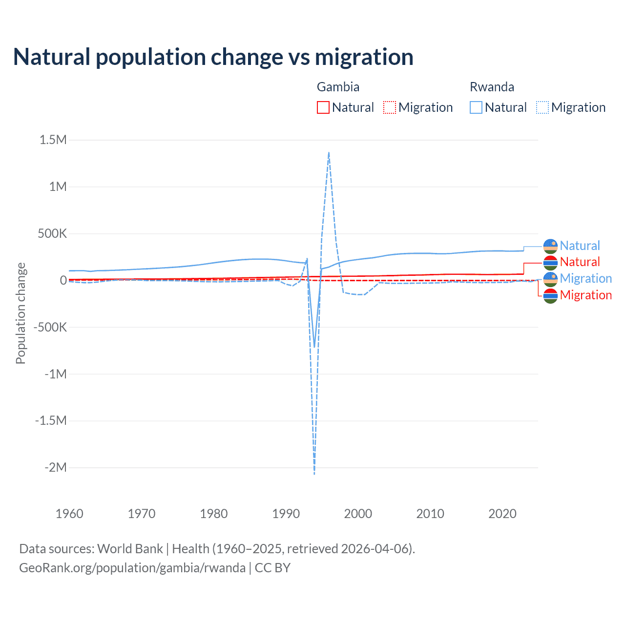 Over the last 10 years, 95.2% of the population change in the Gambia is from natural causes (a gain of 625,795 people) and 4.75% is from migration (a loss of 31,227 people). In Rwanda 93.8% is from natural causes (a gain of 3,081,296 people) and 6.18% is from migration (a loss of 203,035 people).