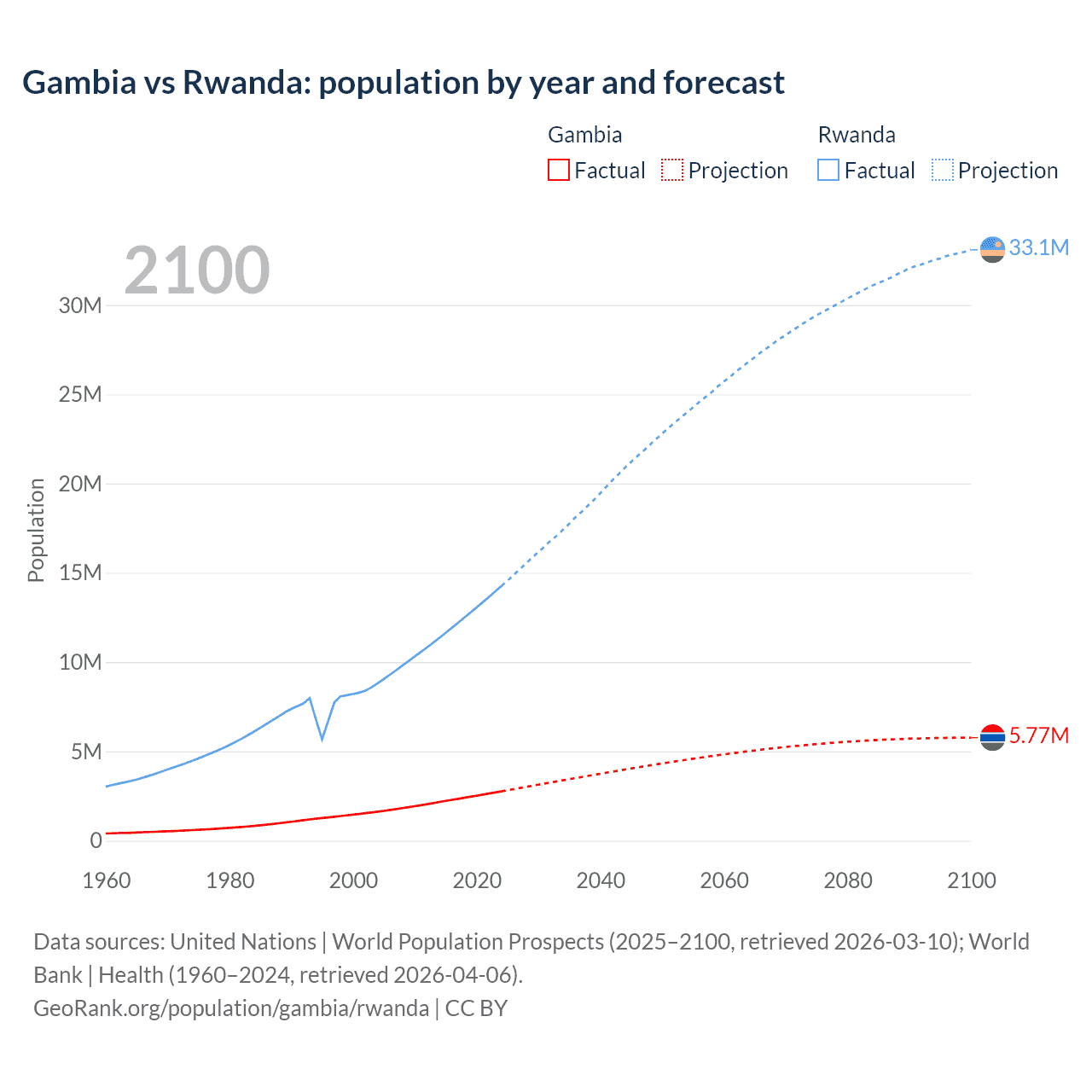 The latest officially reported population of the Gambia was 2,759,988 in 2024 vs 14,256,567 people in Rwanda in 2024. In 2026, based on the adjusted UN estimation, the current Gambia's population is 2,902,554 people compared to 14,975,051 in Rwanda.