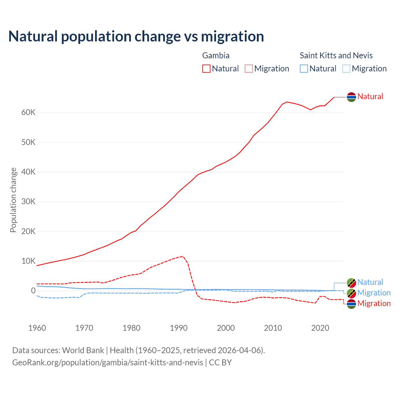 Over the last 10 years, 95.2% of the population change in the Gambia is from natural causes (a gain of 625,795 people) and 4.75% is from migration (a loss of 31,227 people). In Saint Kitts and Nevis 44.9% is from natural causes (a gain of 1,225 people) and 55.1% is from migration (a loss of 1,506 people).
