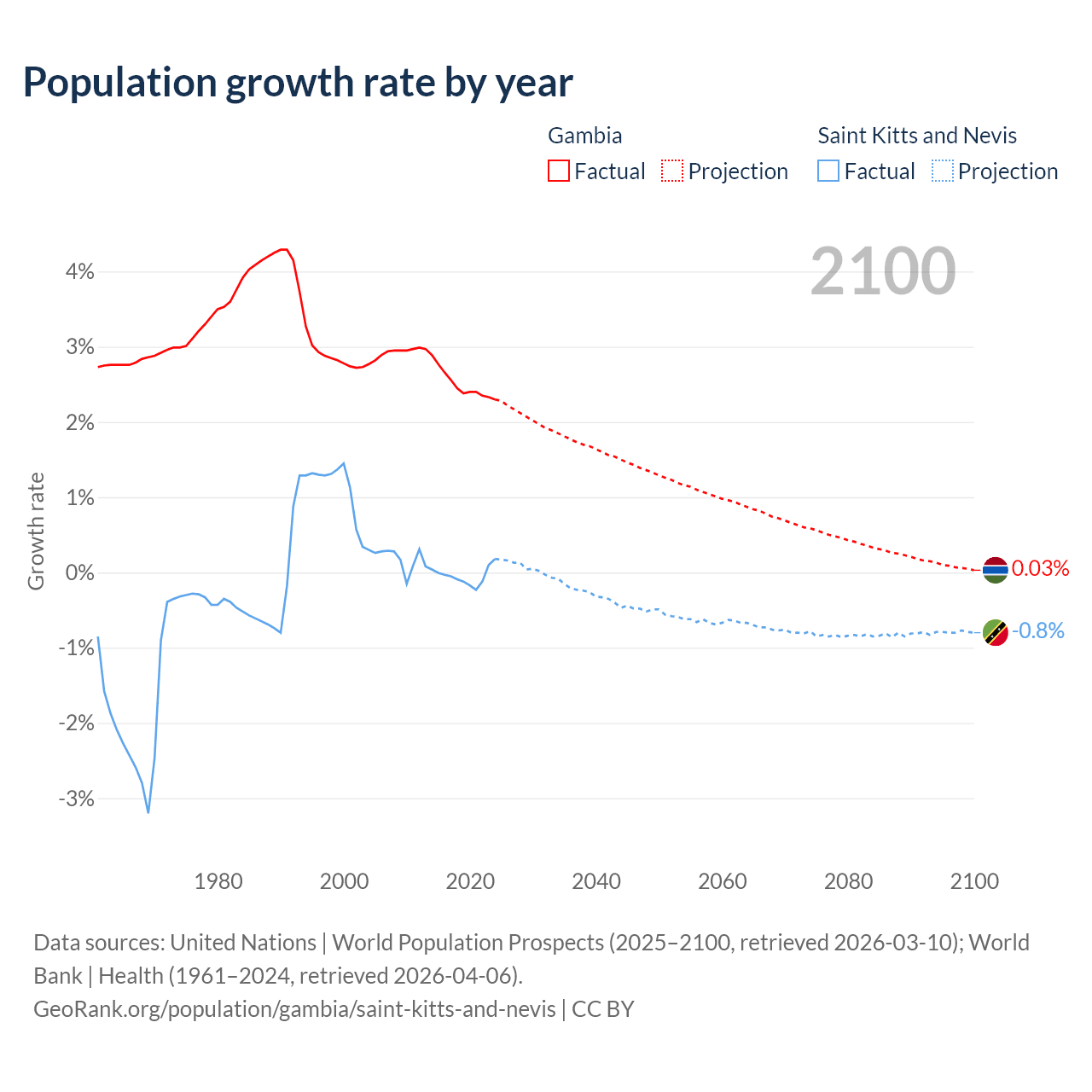 - For the last 10 years, the Gambia has had an average growth rate of +2.5% per year vs -0.04% in Saint Kitts and Nevis.