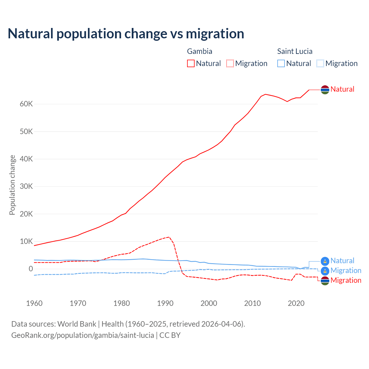 Over the last 10 years, 95.2% of the population change in the Gambia is from natural causes (a gain of 625,795 people) and 4.75% is from migration (a loss of 31,227 people). In Saint Lucia 95.7% is from natural causes (a gain of 6,039 people) and 4.31% is from migration (a loss of 272 people).