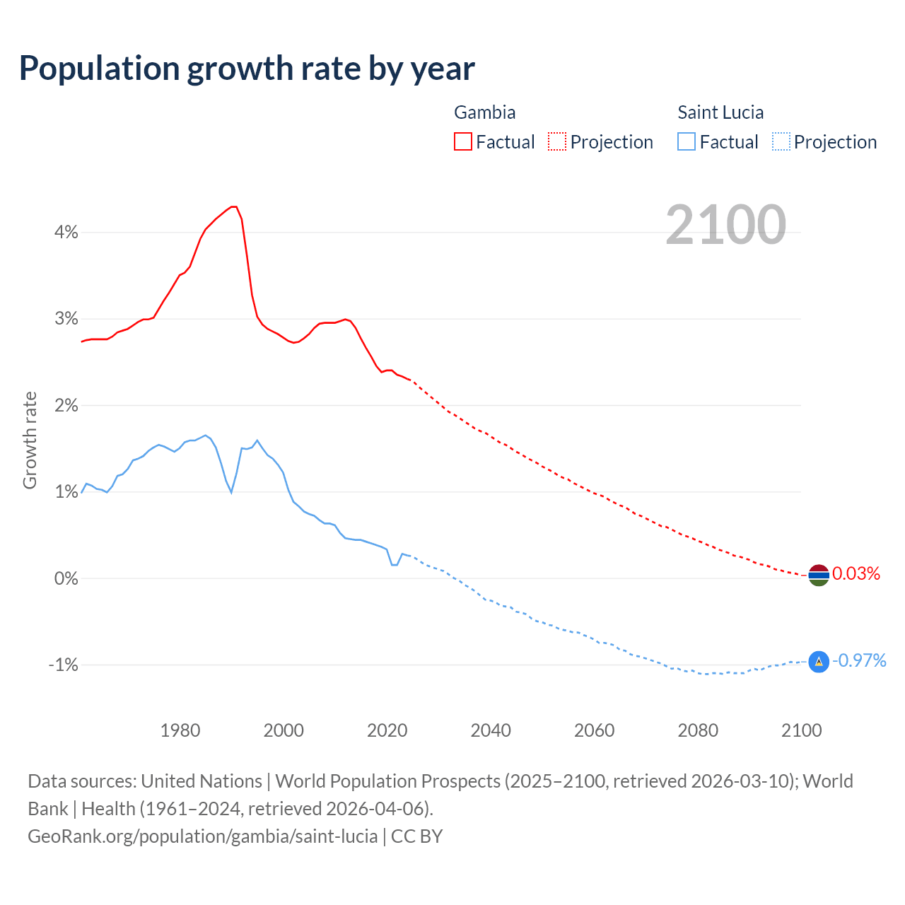- For the last 10 years, the Gambia has had an average growth rate of +2.5% per year vs +0.33% in Saint Lucia.