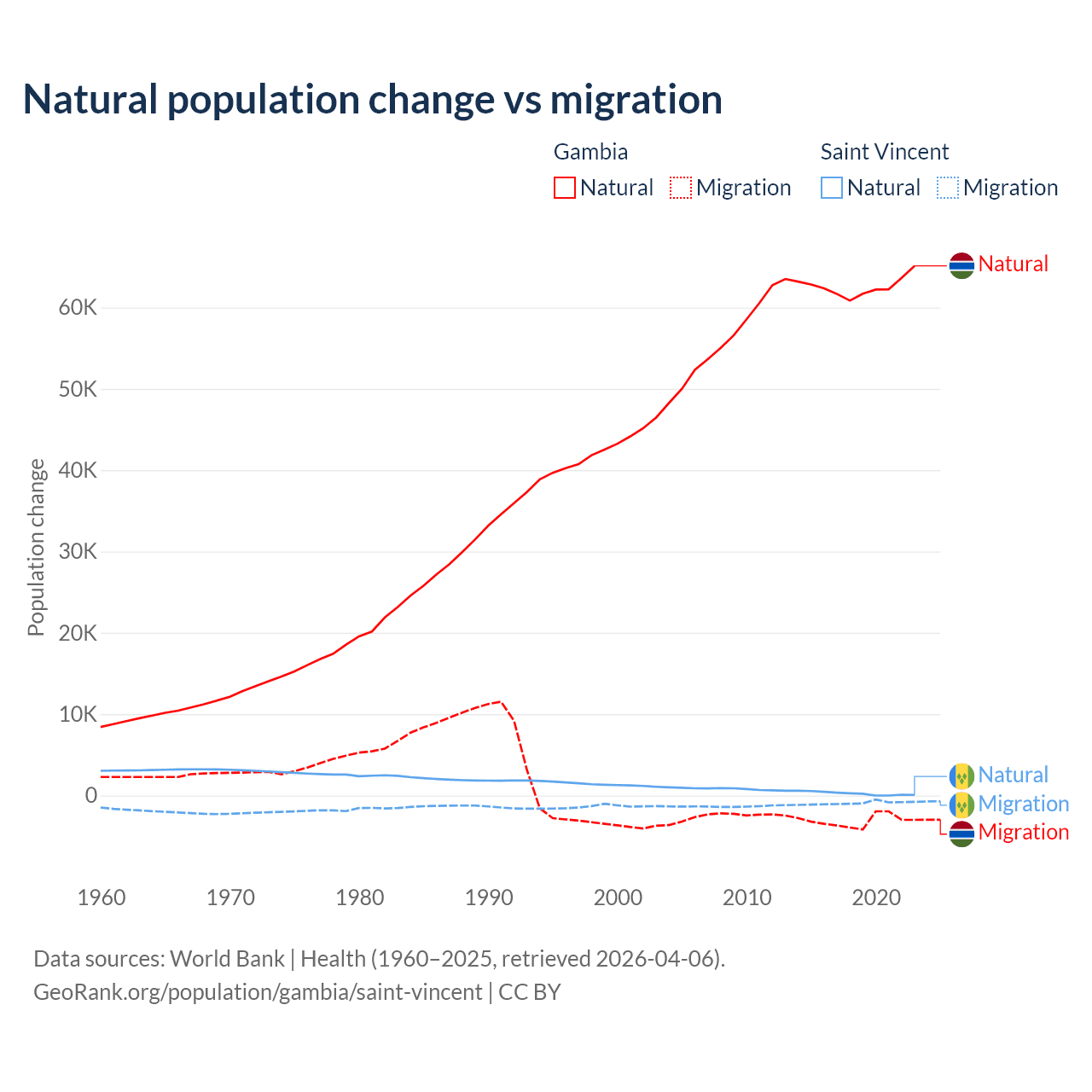 Over the last 10 years, 95.2% of the population change in the Gambia is from natural causes (a gain of 625,795 people) and 4.75% is from migration (a loss of 31,227 people). In Saint Vincent 21.2% is from natural causes (a gain of 2,525 people) and 78.8% is from migration (a loss of 9,393 people).