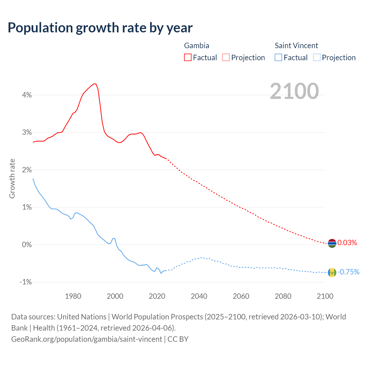 - For the last 10 years, the Gambia has had an average growth rate of +2.5% per year vs -0.65% in Saint Vincent.