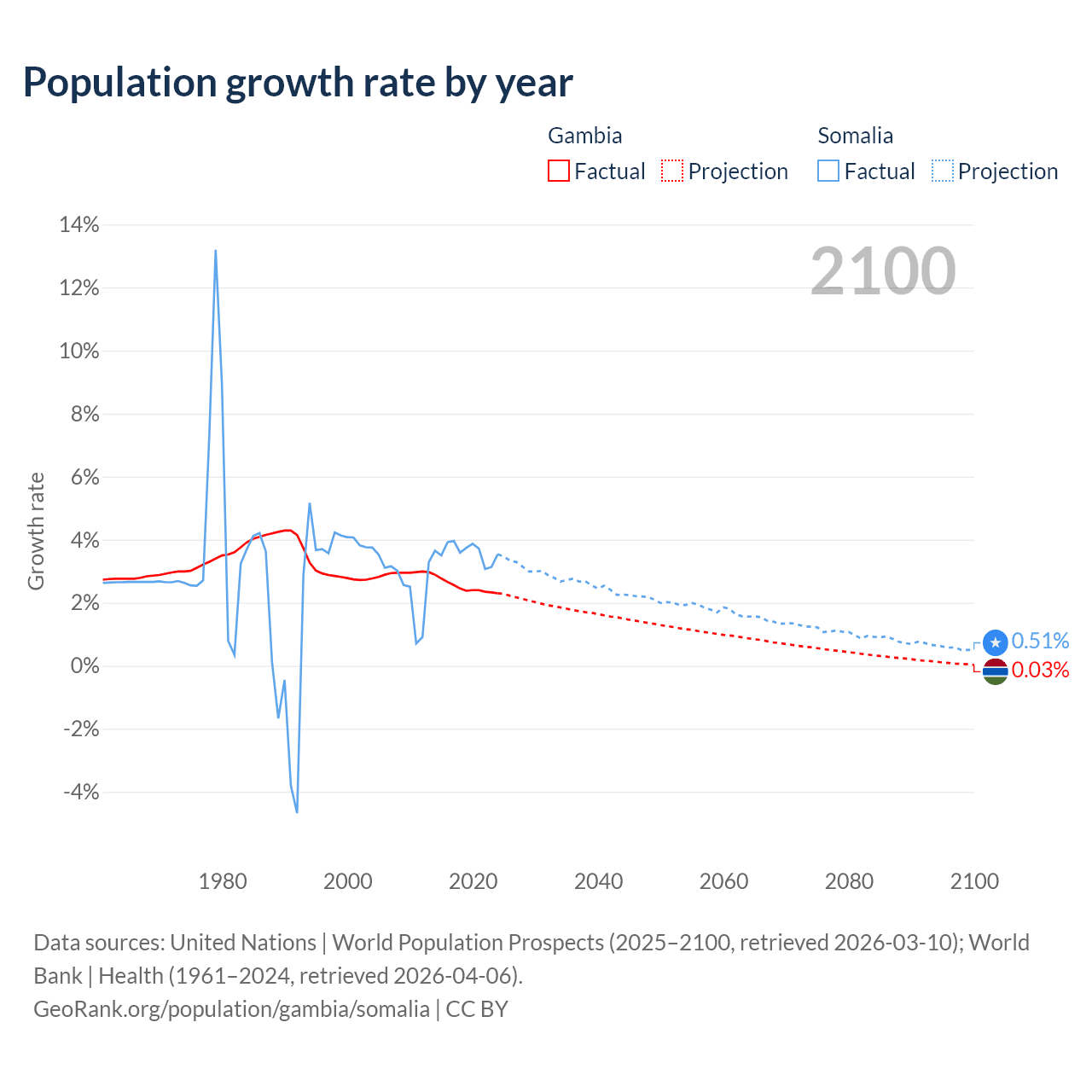 - For the last 10 years, the Gambia has had an average growth rate of +2.5% per year vs +3.61% in Somalia.