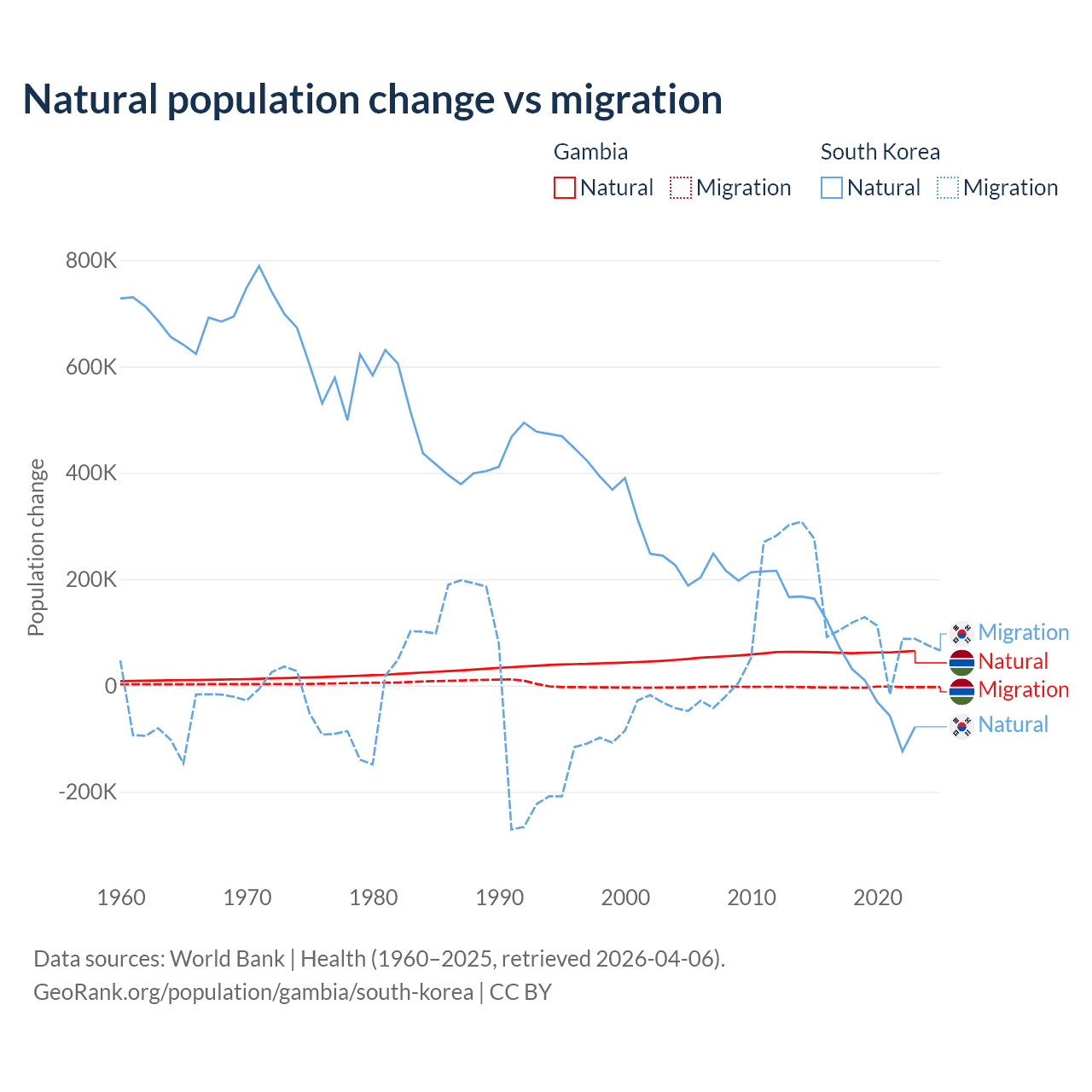 Over the last 10 years, 95.2% of the population change in the Gambia is from natural causes (a gain of 625,795 people) and 4.75% is from migration (a loss of 31,227 people). In South Korea 17.6% is from natural causes (a gain of 277,215 people) and 82.4% is from migration (a gain of 1,298,356 people).