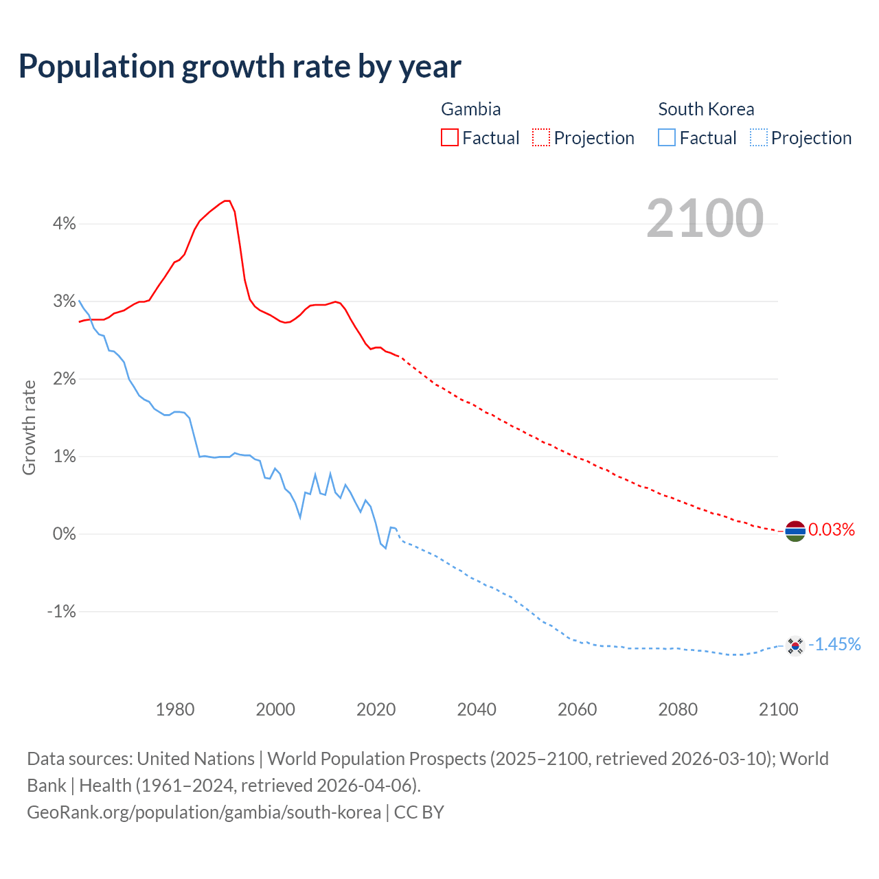 - For the last 10 years, the Gambia has had an average growth rate of +2.5% per year vs +0.24% in South Korea.