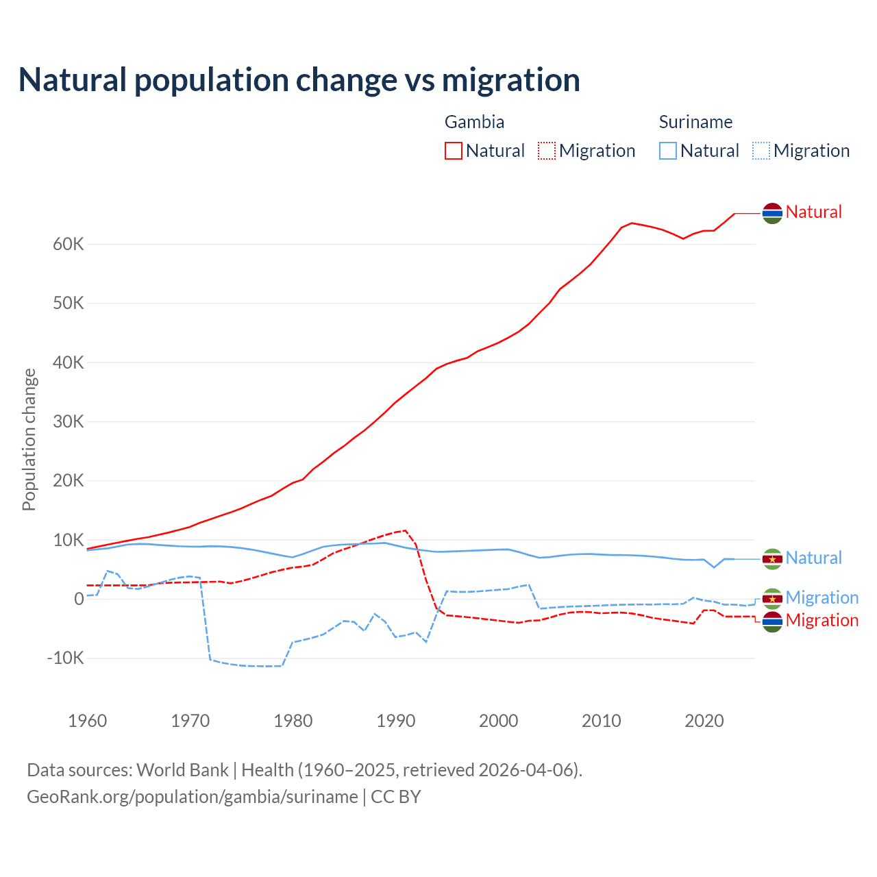 Over the last 10 years, 95.2% of the population change in the Gambia is from natural causes (a gain of 625,795 people) and 4.75% is from migration (a loss of 31,227 people). In Suriname 90.3% is from natural causes (a gain of 66,709 people) and 9.72% is from migration (a loss of 7,185 people).