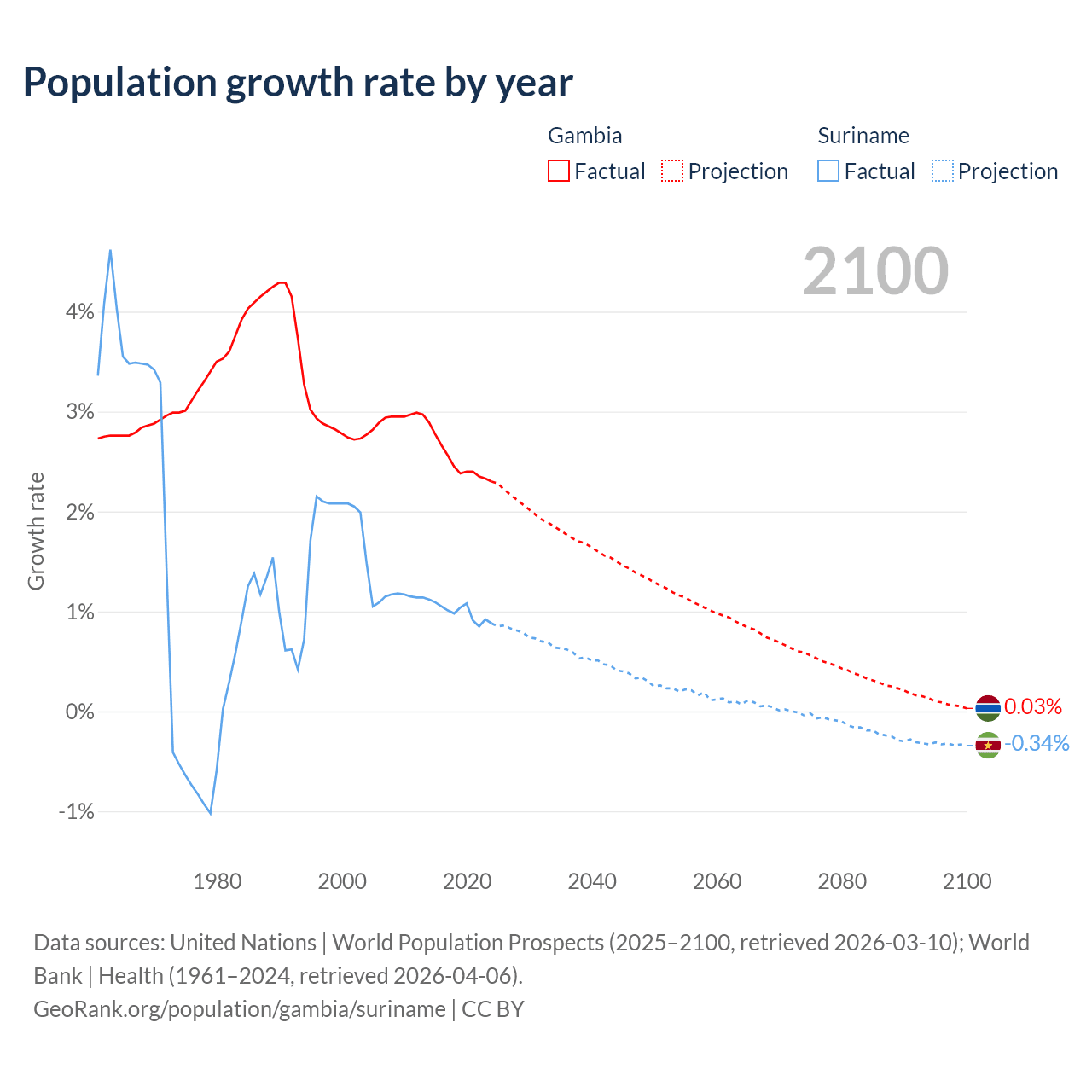 - For the last 10 years, the Gambia has had an average growth rate of +2.5% per year vs +0.99% in Suriname.