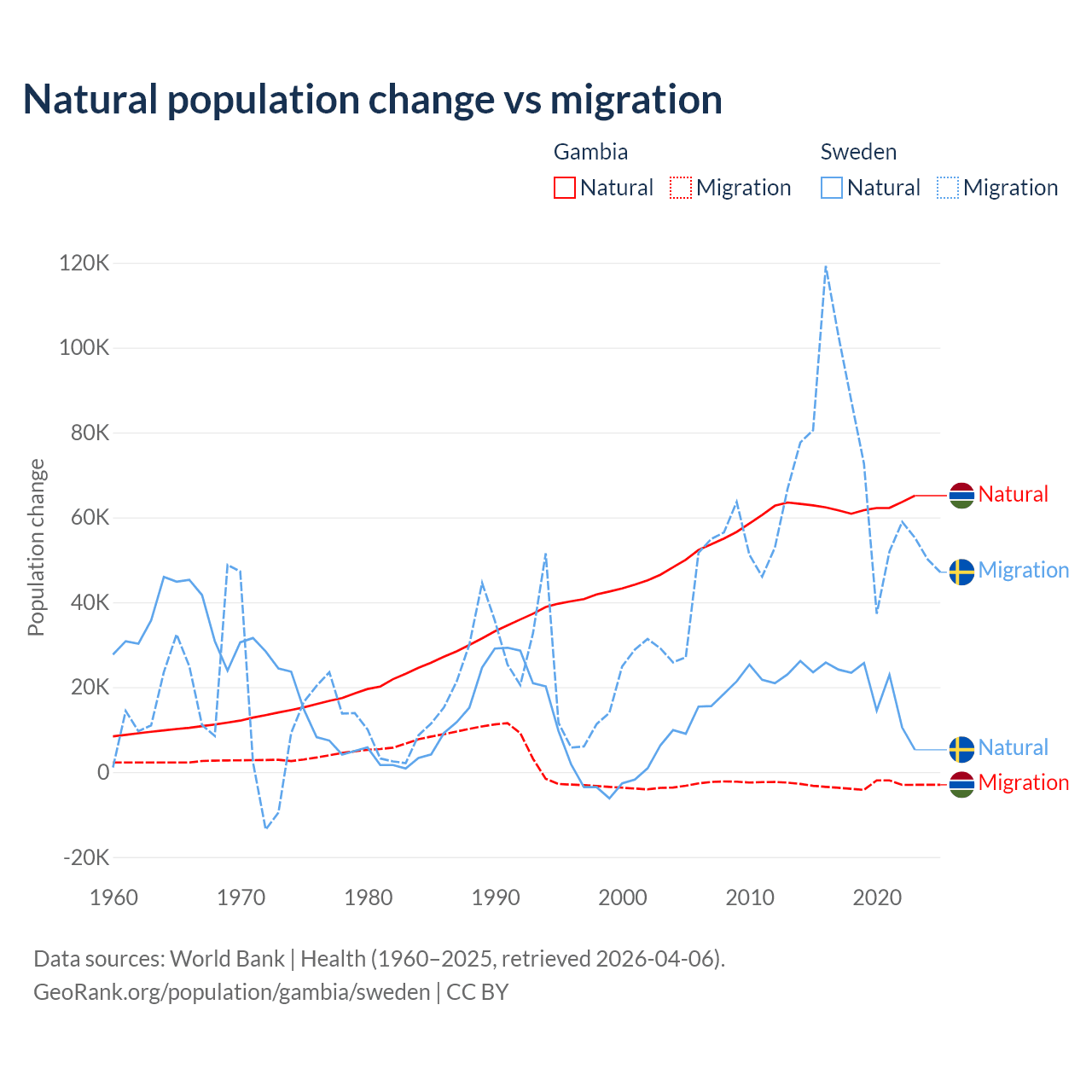 Over the last 10 years, 95.2% of the population change in the Gambia is from natural causes (a gain of 625,795 people) and 4.75% is from migration (a loss of 31,227 people). In Sweden 21.4% is from natural causes (a gain of 201,900 people) and 78.6% is from migration (a gain of 743,642 people).