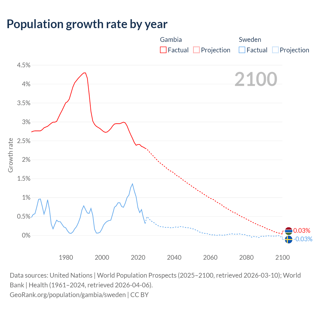 - For the last 10 years, the Gambia has had an average growth rate of +2.5% per year vs +0.88% in Sweden.