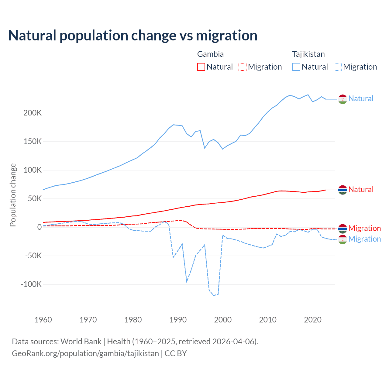 Over the last 10 years, 95.2% of the population change in the Gambia is from natural causes (a gain of 625,795 people) and 4.75% is from migration (a loss of 31,227 people). In Tajikistan 96% is from natural causes (a gain of 2,266,045 people) and 3.95% is from migration (a loss of 93,205 people).