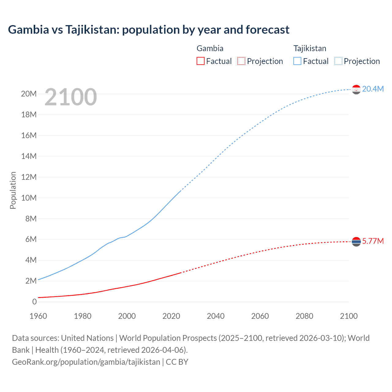 Gambia vs Tajikistan: population by year and forecast