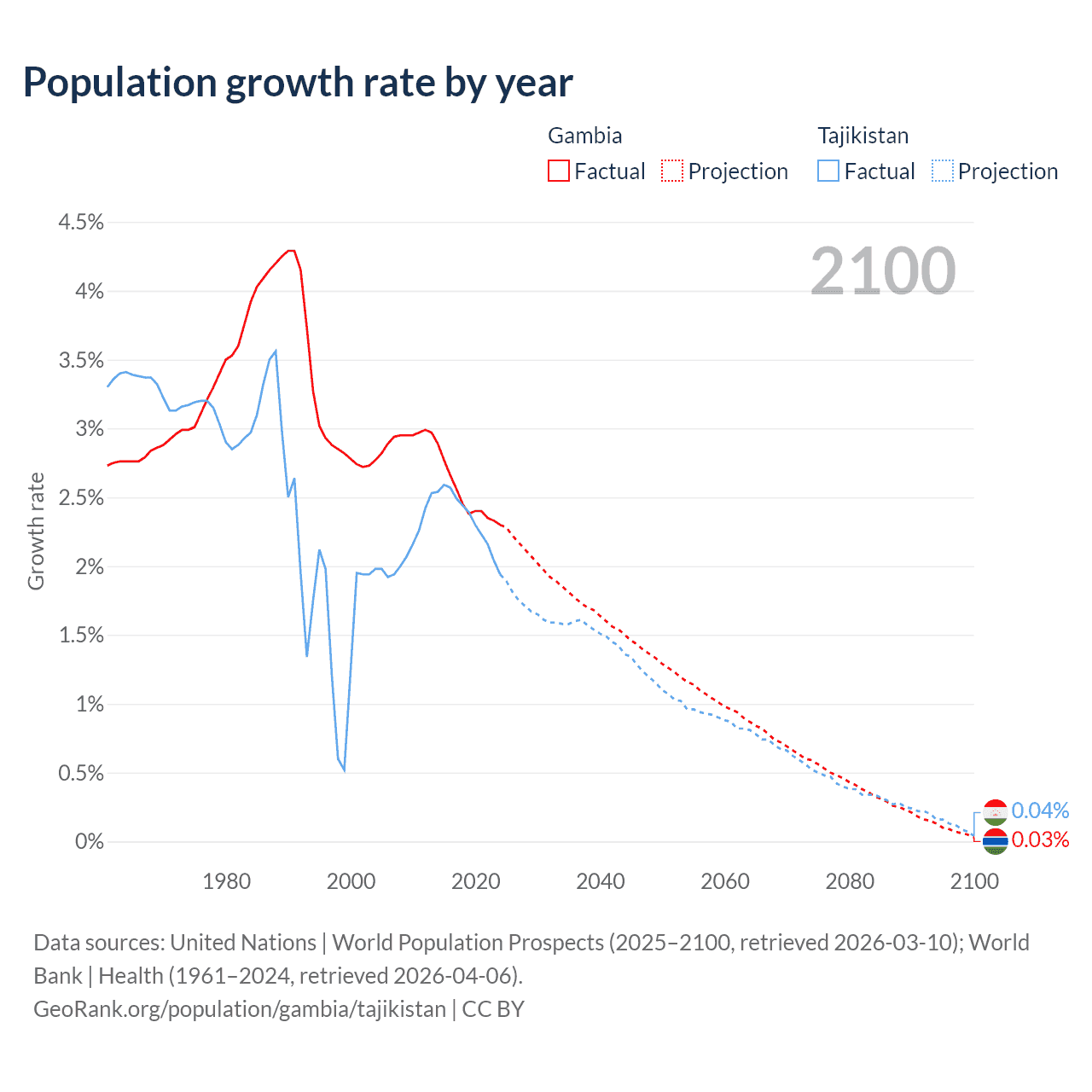 - For the last 10 years, the Gambia has had an average growth rate of +2.5% per year vs +2.33% in Tajikistan.