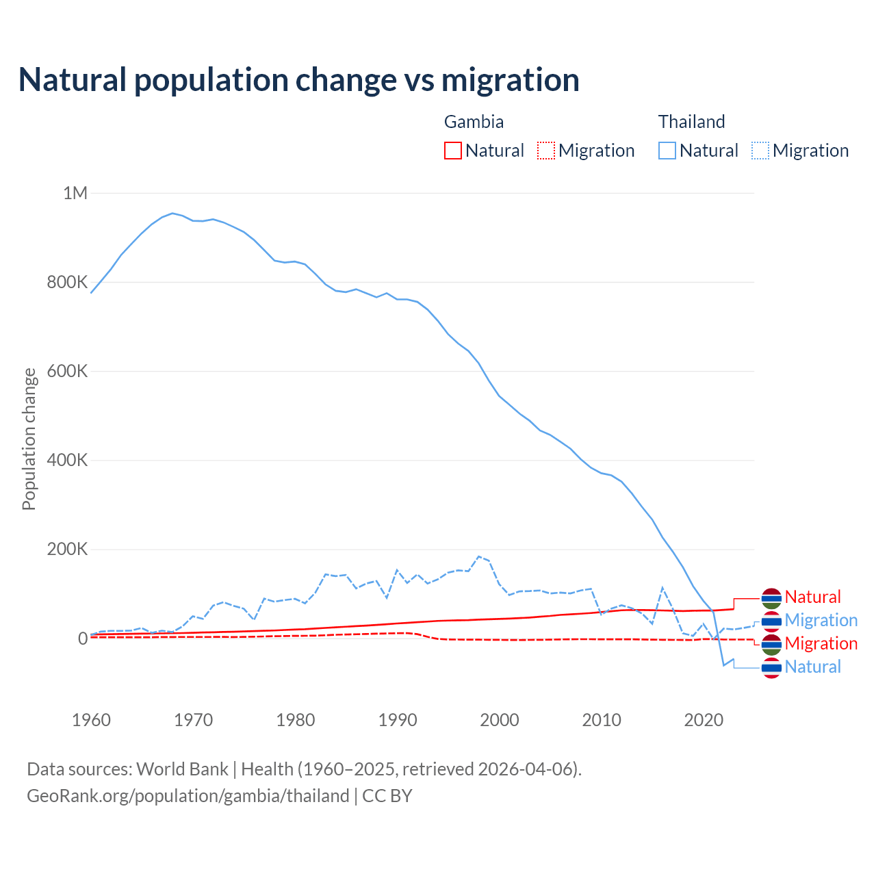 Over the last 10 years, 95.2% of the population change in the Gambia is from natural causes (a gain of 625,795 people) and 4.75% is from migration (a loss of 31,227 people). In Thailand 78.4% is from natural causes (a gain of 1,292,528 people) and 21.6% is from migration (a gain of 355,361 people).