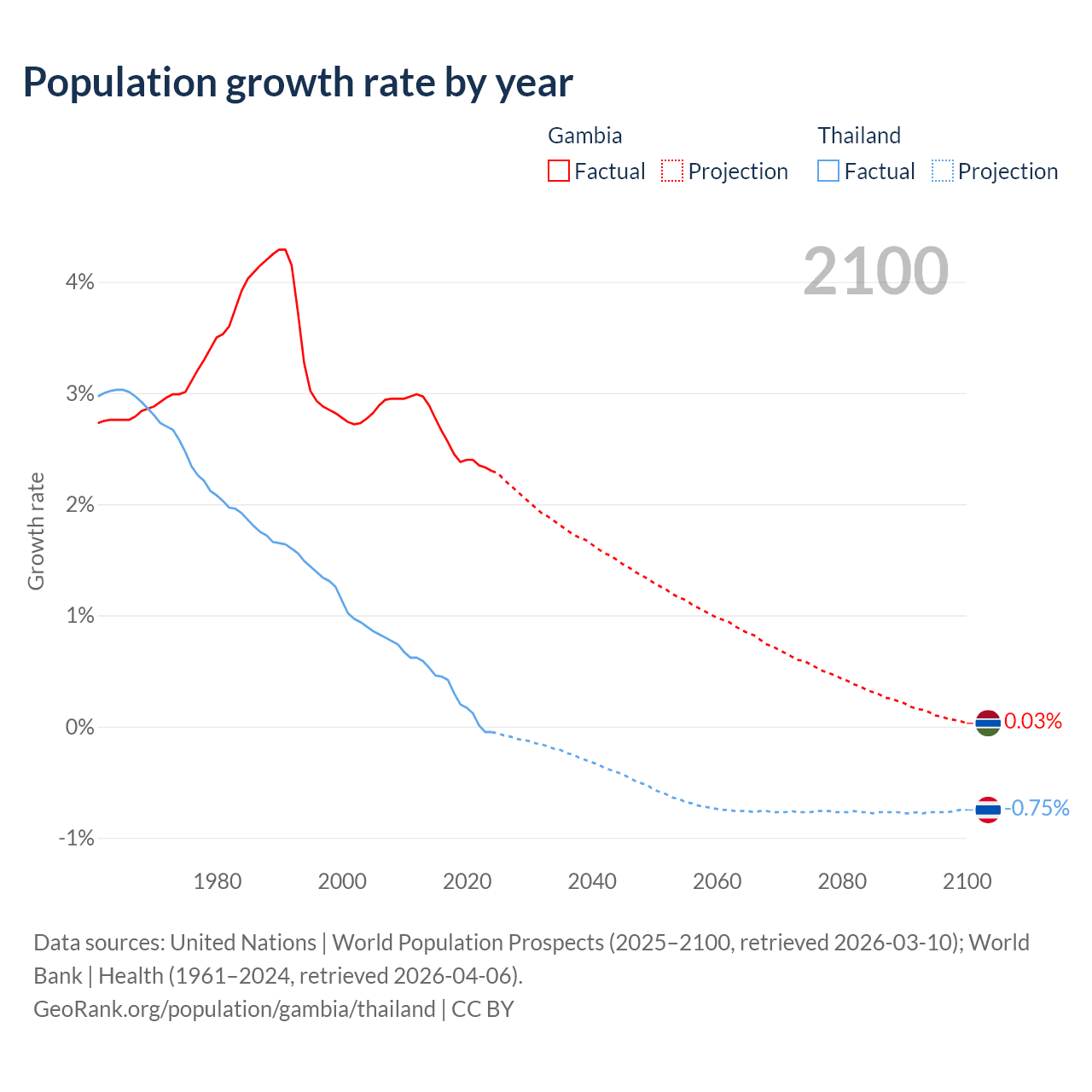 - For the last 10 years, the Gambia has had an average growth rate of +2.5% per year vs +0.23% in Thailand.
