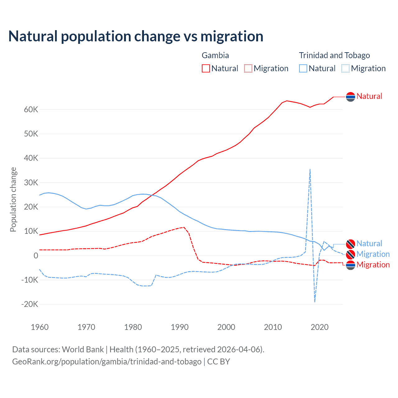 Over the last 10 years, 95.2% of the population change in the Gambia is from natural causes (a gain of 625,795 people) and 4.75% is from migration (a loss of 31,227 people). In Trinidad and Tobago 66% is from natural causes (a gain of 55,887 people) and 34% is from migration (a gain of 28,785 people).