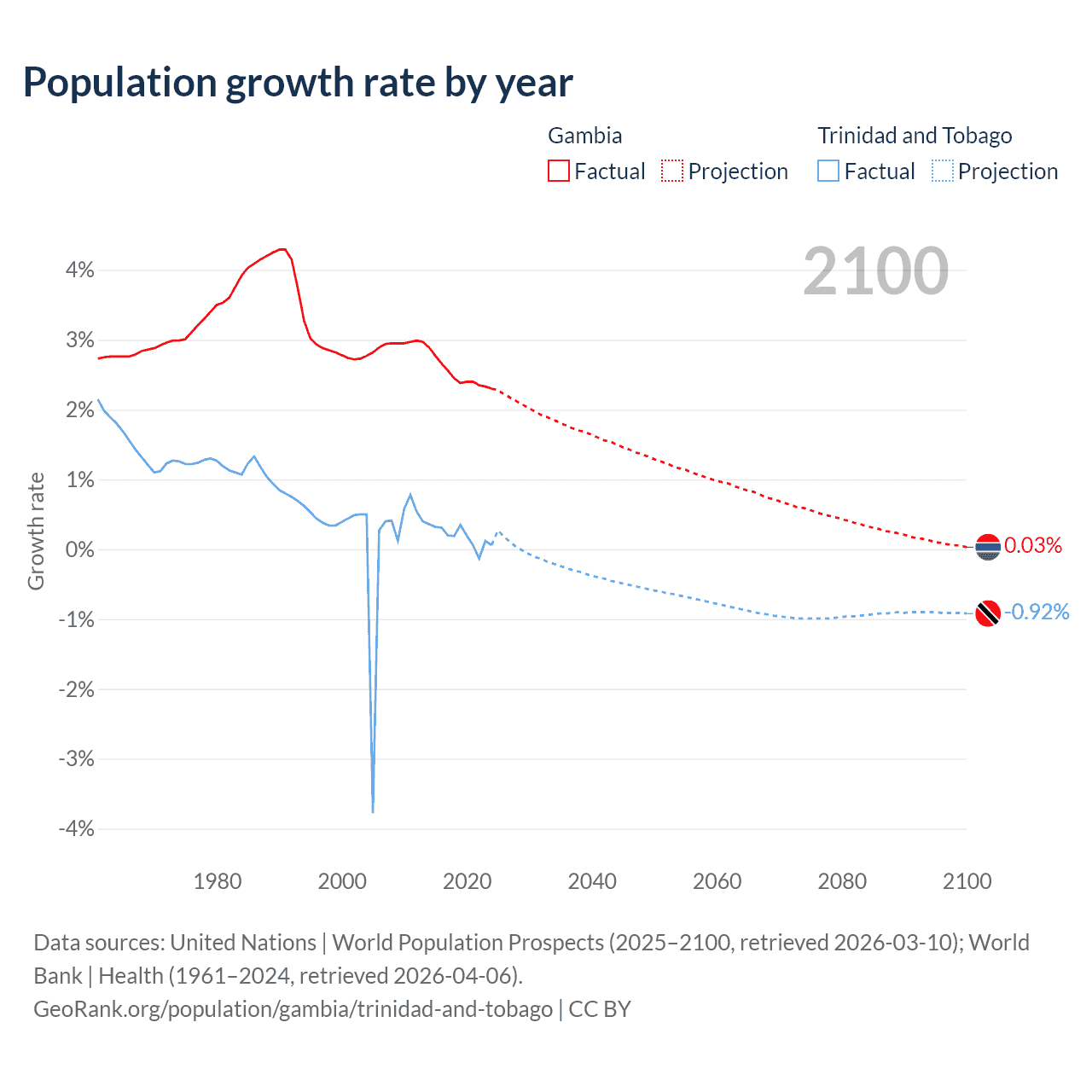- For the last 10 years, the Gambia has had an average growth rate of +2.5% per year vs +0.19% in Trinidad and Tobago.