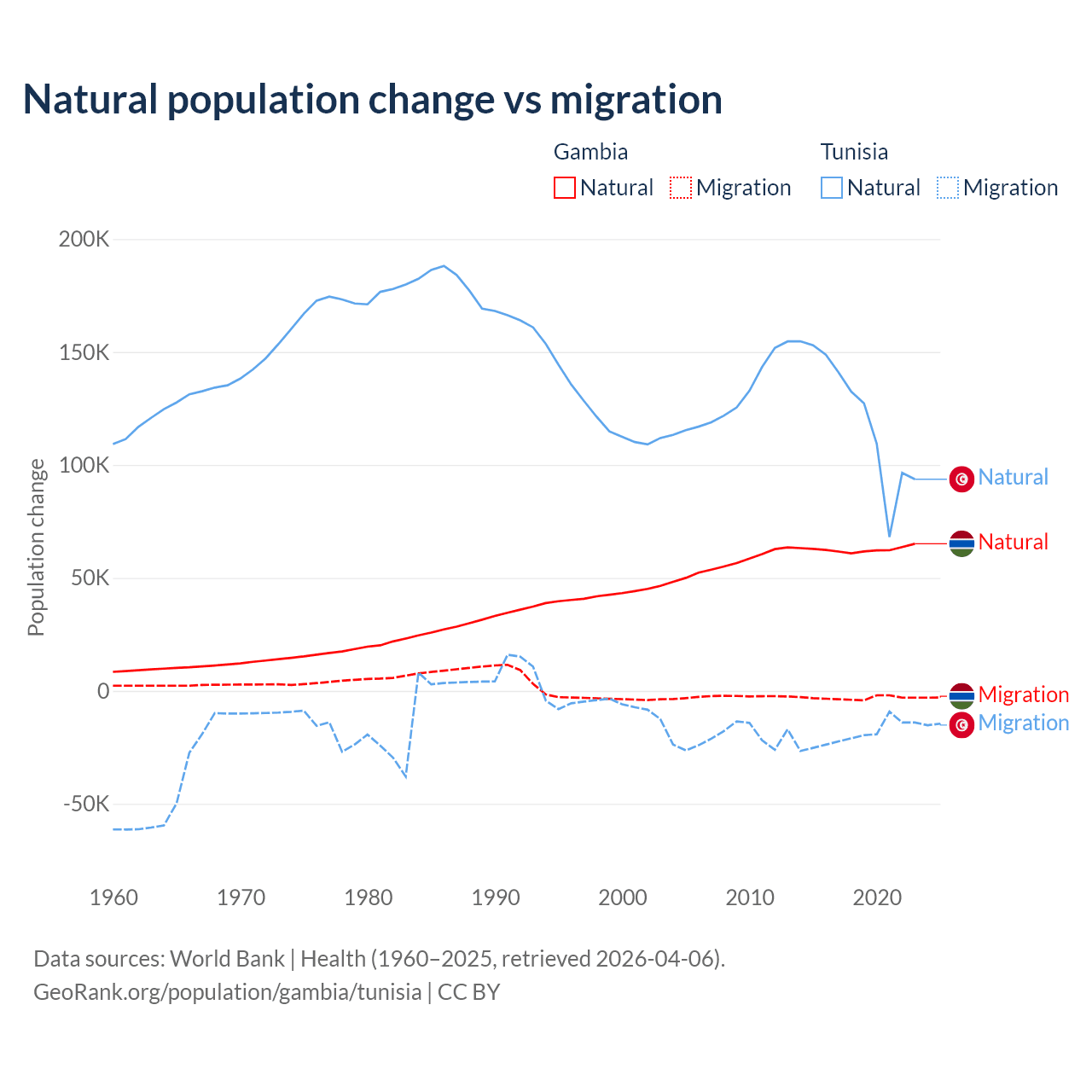 Over the last 10 years, 95.2% of the population change in the Gambia is from natural causes (a gain of 625,795 people) and 4.75% is from migration (a loss of 31,227 people). In Tunisia 86.3% is from natural causes (a gain of 1,225,079 people) and 13.7% is from migration (a loss of 195,011 people).