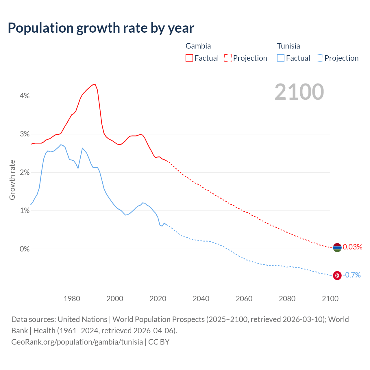 - For the last 10 years, the Gambia has had an average growth rate of +2.5% per year vs +0.89% in Tunisia.