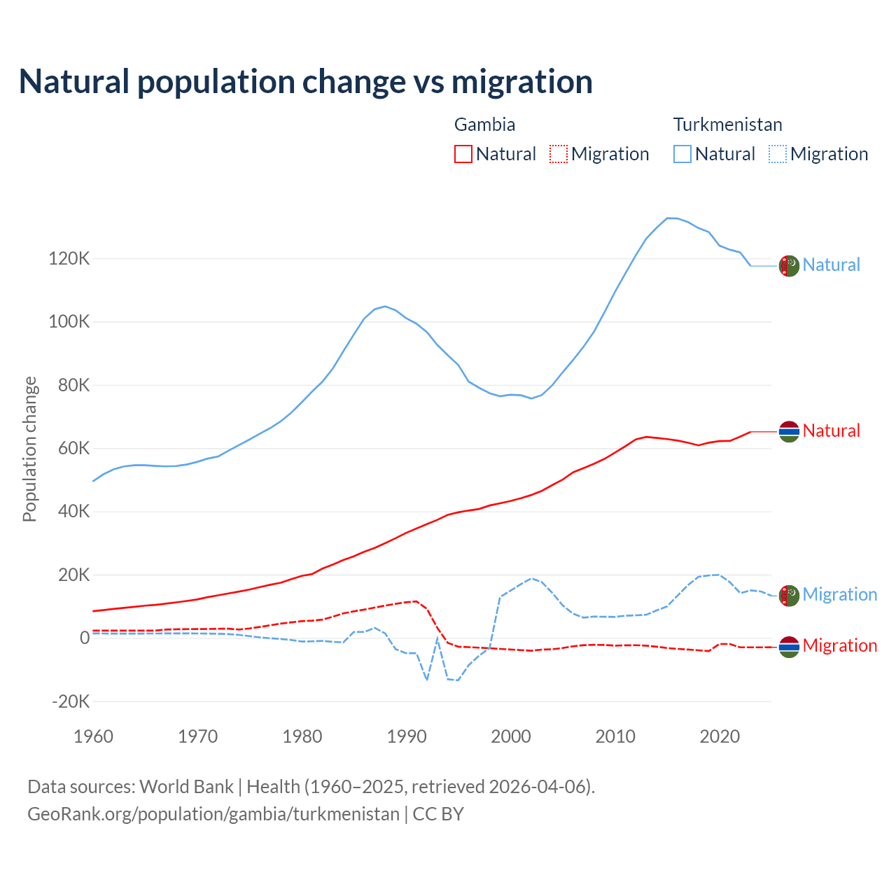Over the last 10 years, 95.2% of the population change in the Gambia is from natural causes (a gain of 625,795 people) and 4.75% is from migration (a loss of 31,227 people). In Turkmenistan 89.2% is from natural causes (a gain of 1,270,228 people) and 10.8% is from migration (a gain of 154,379 people).