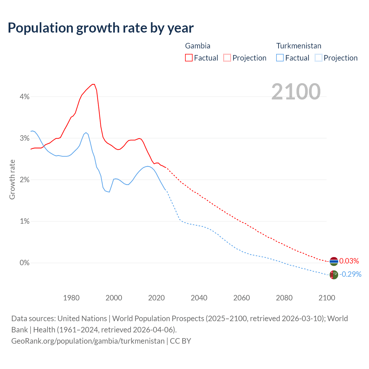 - For the last 10 years, the Gambia has had an average growth rate of +2.5% per year vs +2.14% in Turkmenistan.