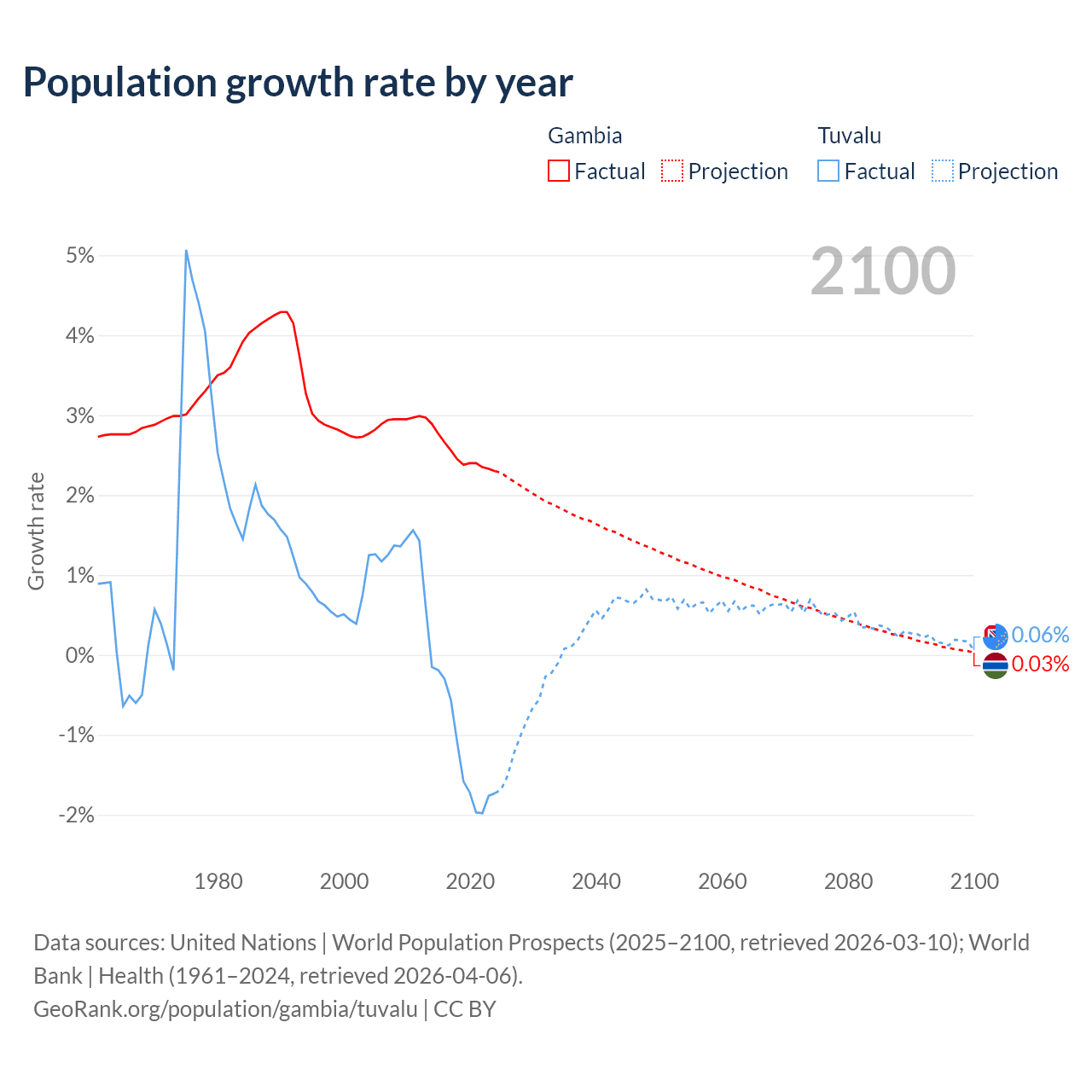 - For the last 10 years, the Gambia has had an average growth rate of +2.5% per year vs -1.19% in Tuvalu.
