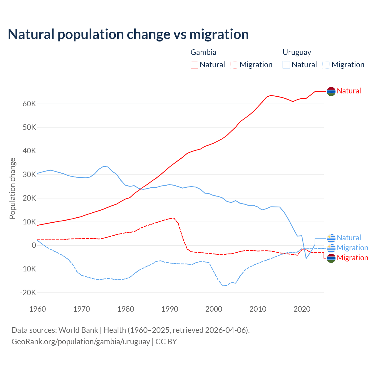 Over the last 10 years, 95.2% of the population change in the Gambia is from natural causes (a gain of 625,795 people) and 4.75% is from migration (a loss of 31,227 people). In Uruguay 70% is from natural causes (a gain of 64,303 people) and 30% is from migration (a loss of 27,501 people).