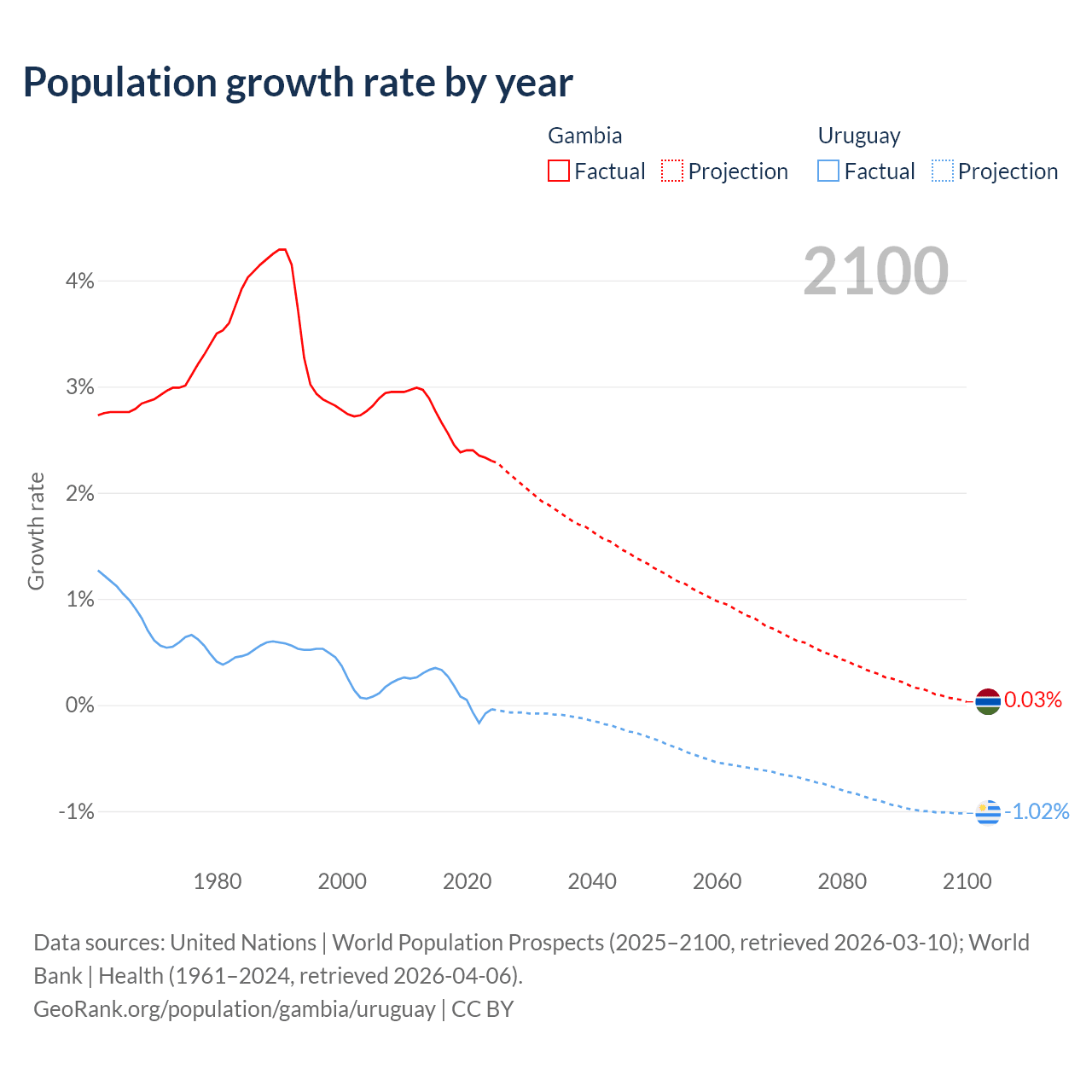 - For the last 10 years, the Gambia has had an average growth rate of +2.5% per year vs +0.11% in Uruguay.