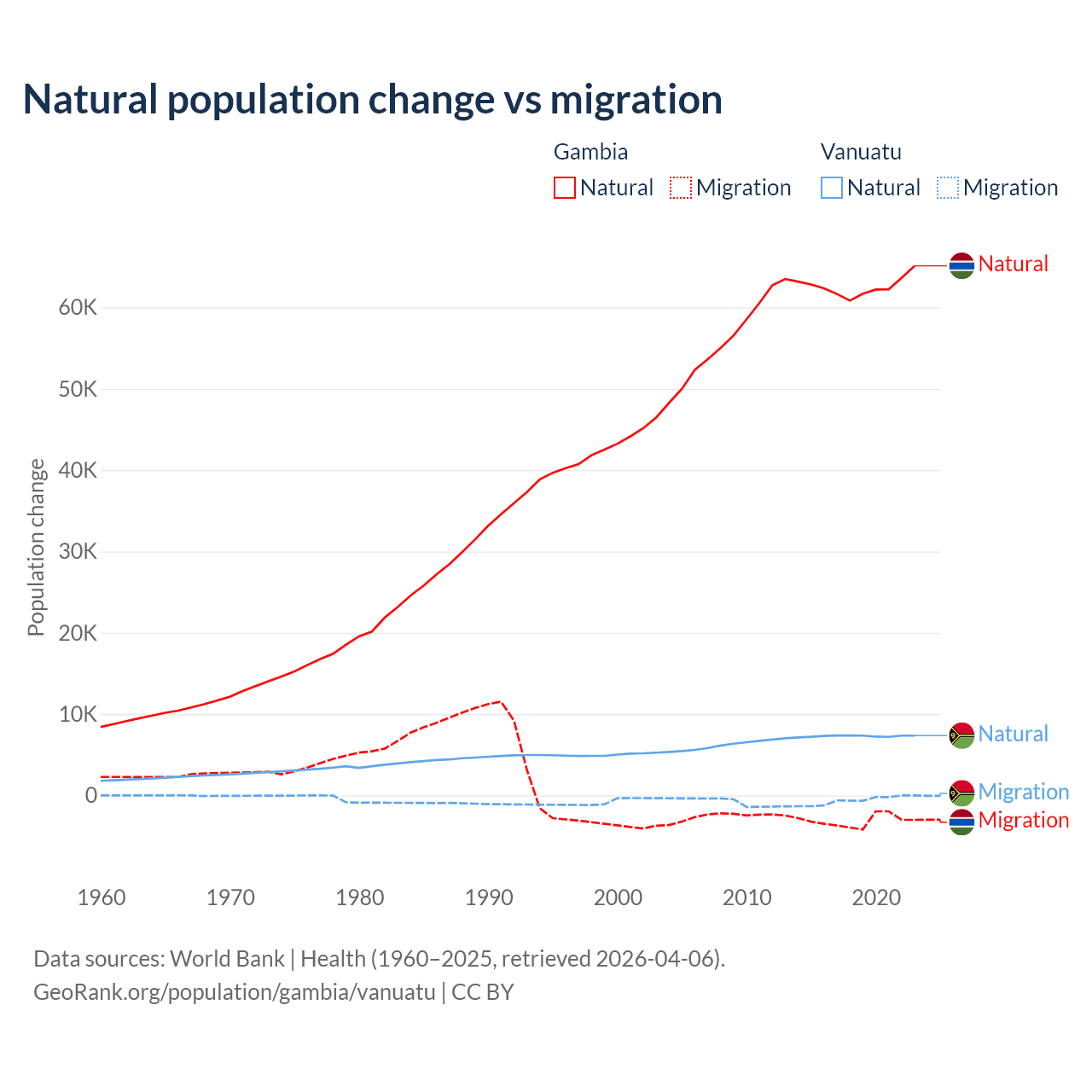 Over the last 10 years, 95.2% of the population change in the Gambia is from natural causes (a gain of 625,795 people) and 4.75% is from migration (a loss of 31,227 people). In Vanuatu 92.2% is from natural causes (a gain of 72,941 people) and 7.81% is from migration (a loss of 6,181 people).