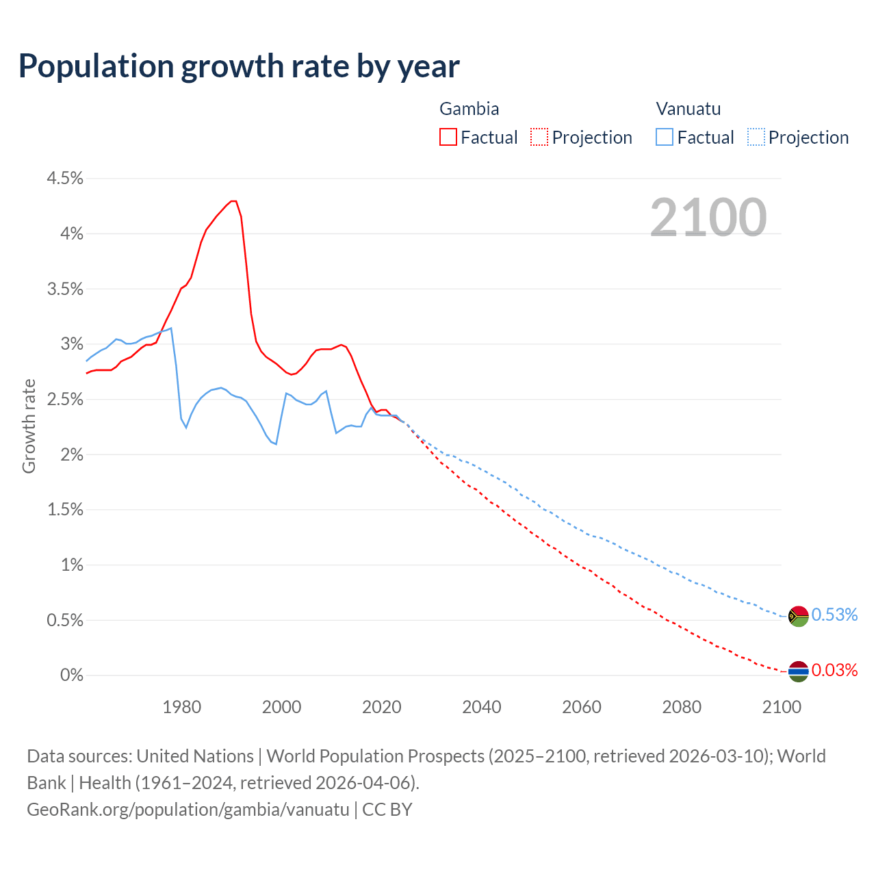 - For the last 10 years, the Gambia has had an average growth rate of +2.5% per year vs +2.33% in Vanuatu.