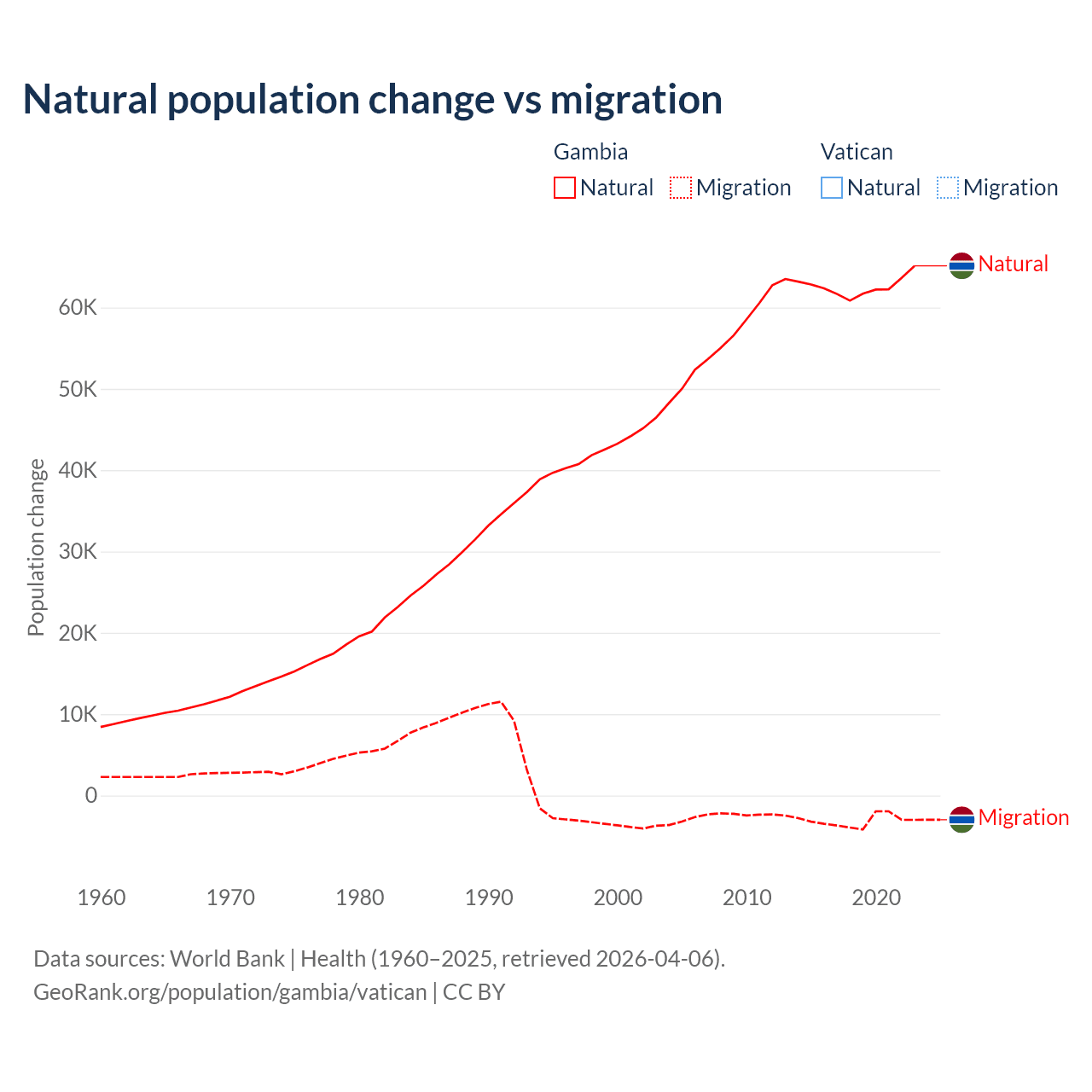 - For the last 10 years, the Gambia has had an average growth rate of +2.5% per year vs +1.9% in the Vatican.