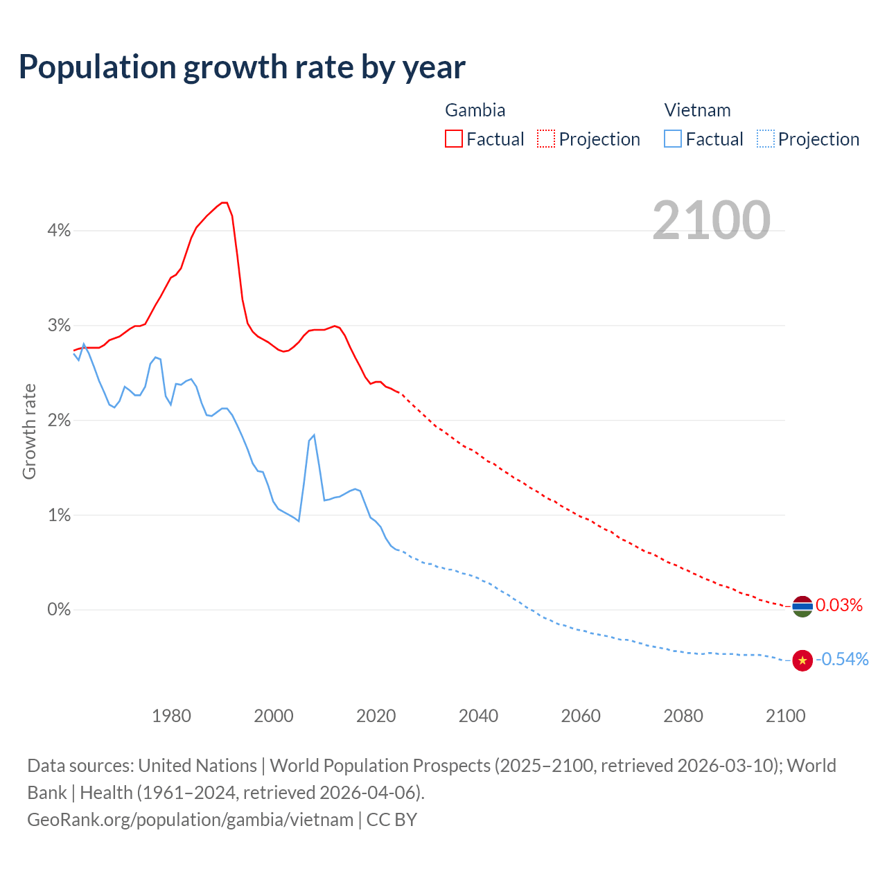 - For the last 10 years, the Gambia has had an average growth rate of +2.5% per year vs +0.99% in Vietnam.