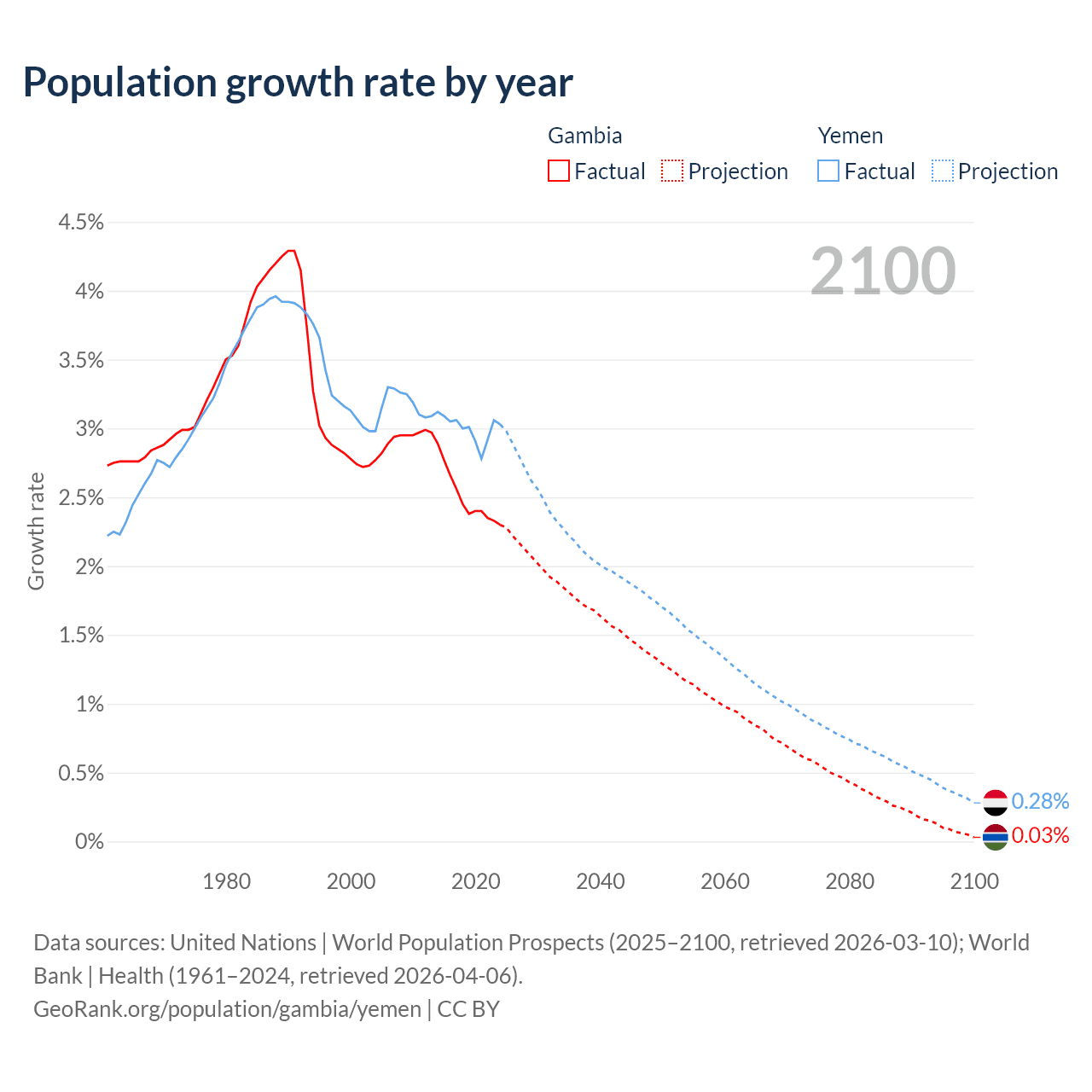 - For the last 10 years, the Gambia has had an average growth rate of +2.5% per year vs +3% in Yemen.