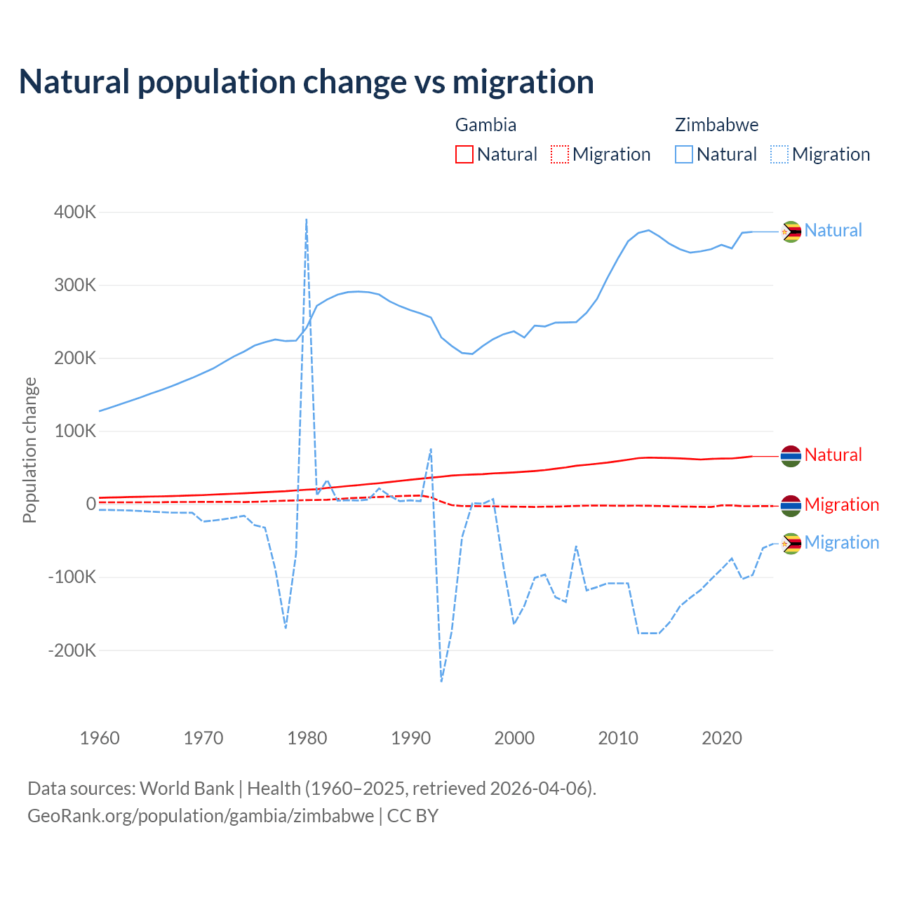 Over the last 10 years, 95.2% of the population change in the Gambia is from natural causes (a gain of 625,795 people) and 4.75% is from migration (a loss of 31,227 people). In Zimbabwe 74.9% is from natural causes (a gain of 3,558,487 people) and 25.1% is from migration (a loss of 1,192,807 people).