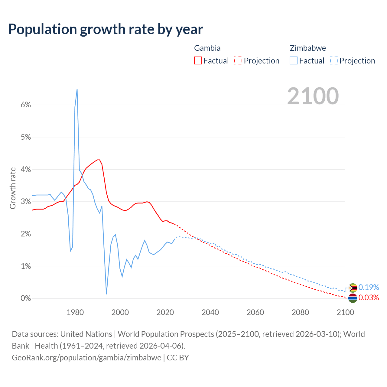- For the last 10 years, the Gambia has had an average growth rate of +2.5% per year vs +1.57% in Zimbabwe.