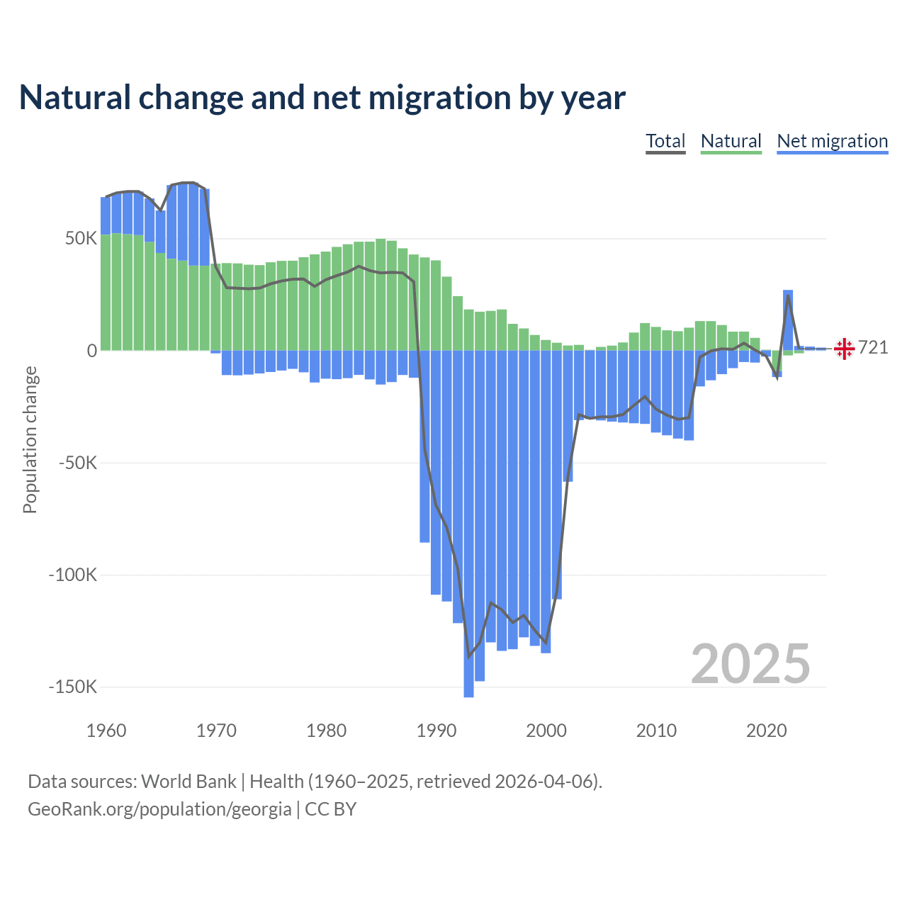 Over the last 10 years, 57.7% of the population change in Georgia is from natural causes (a gain of 47,646 people) and 42.3% is from migration (a loss of 34,907 people).