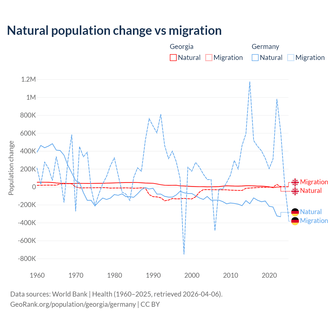Over the last 10 years, 57.7% of the population change in Georgia is from natural causes (a gain of 47,646 people) and 42.3% is from migration (a loss of 34,907 people). In Germany 26.8% is from natural causes (a loss of 2,036,130 people) and 73.2% is from migration (a gain of 5,565,916 people).